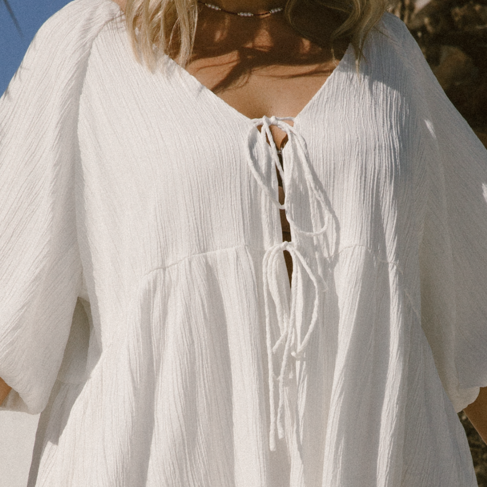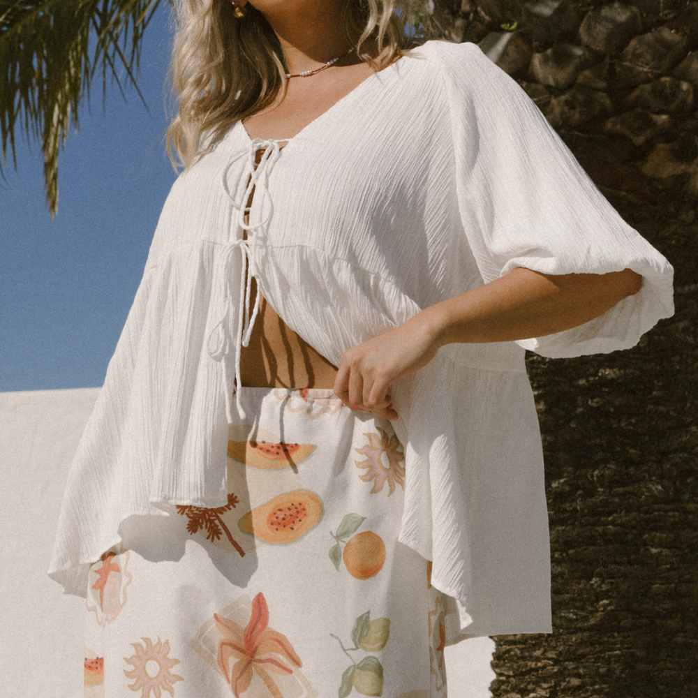 Crafted from a dreamy Viscose & Cotton blend fabric, the Frankie Top is your new everyday go-to with main character charm. Featuring a cross-over bust, floaty puff sleeves, and a cute front-tie moment, she’s breezy, easy, and ready for whatever your day throws at you.