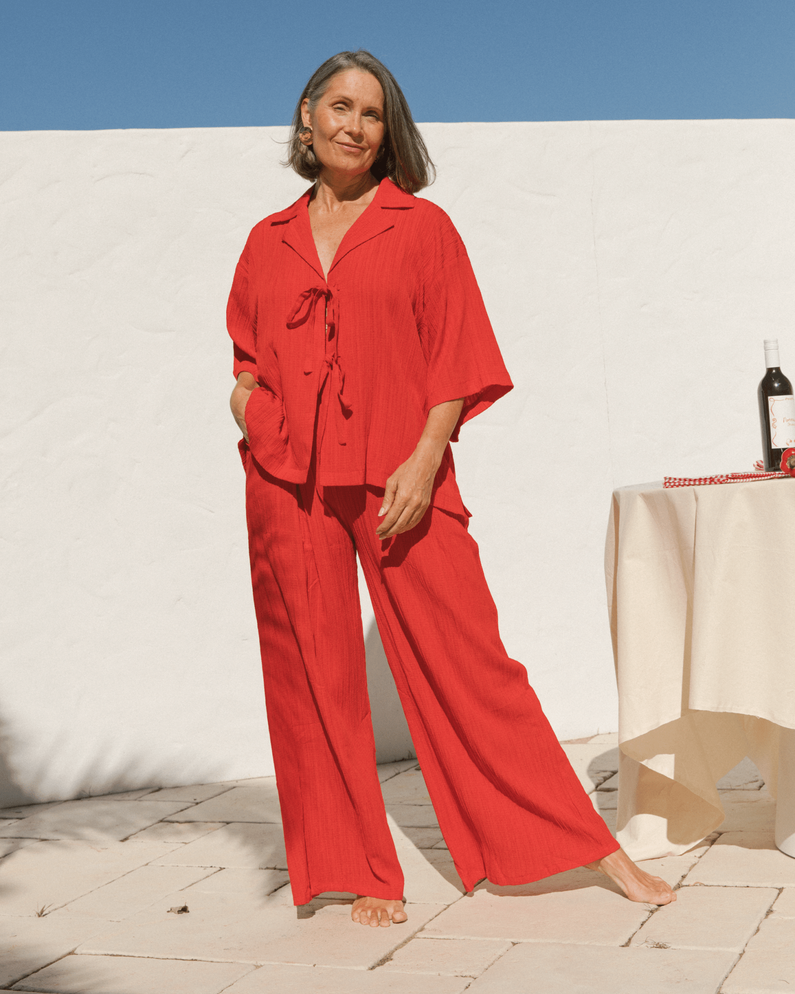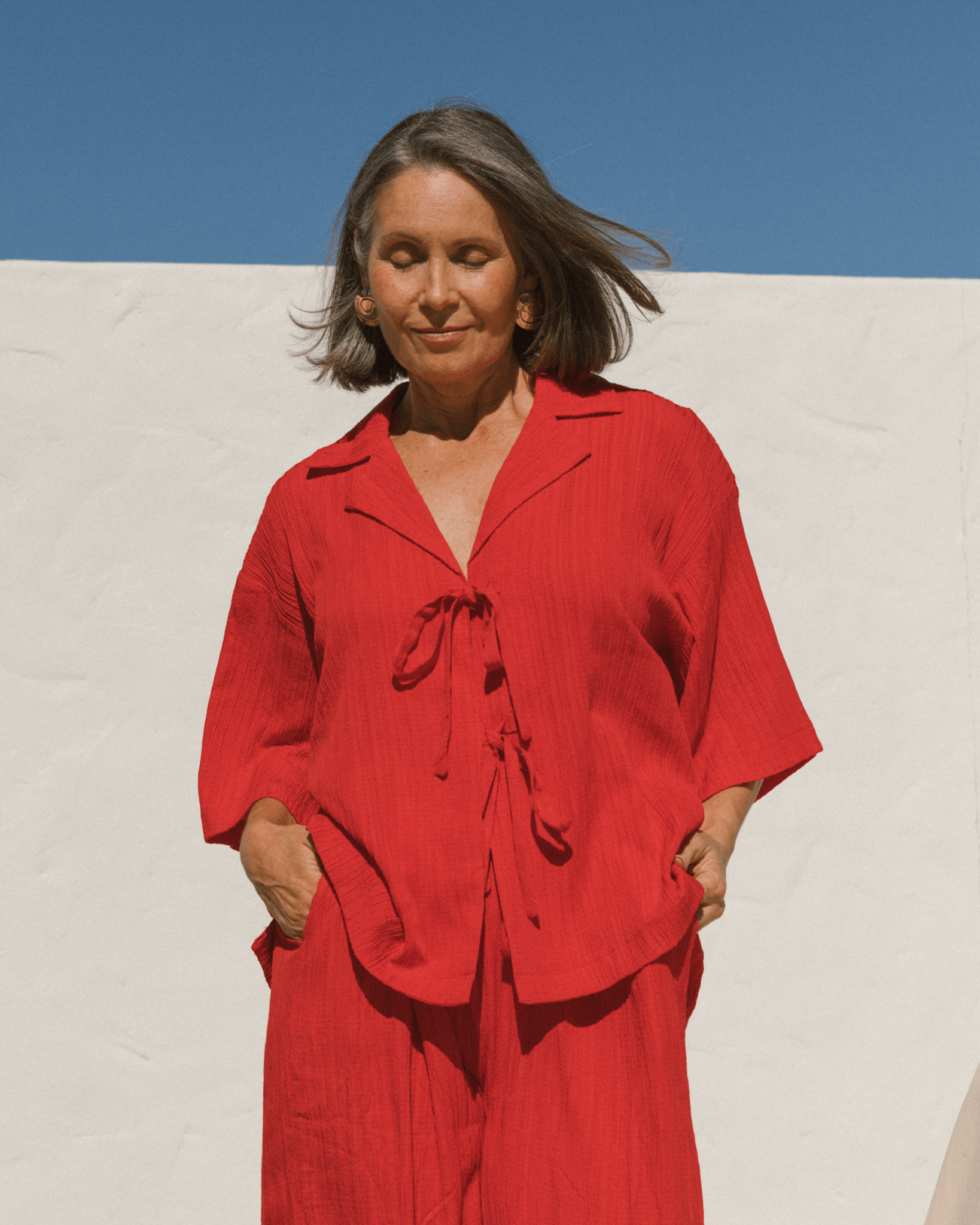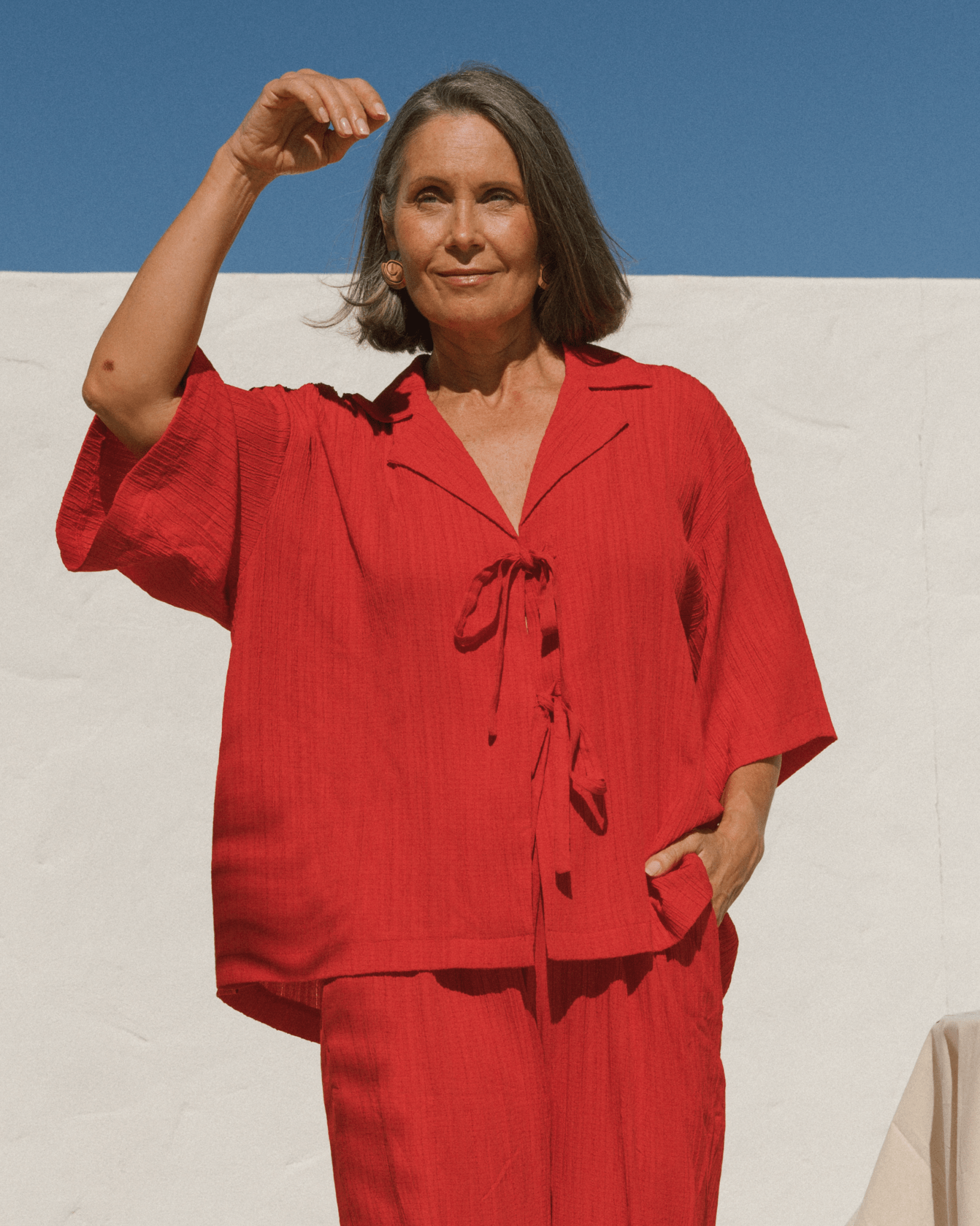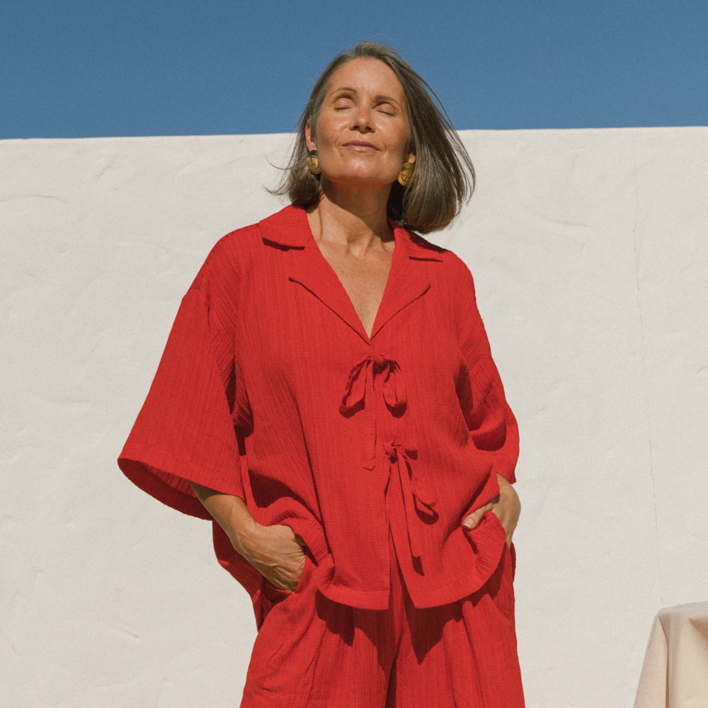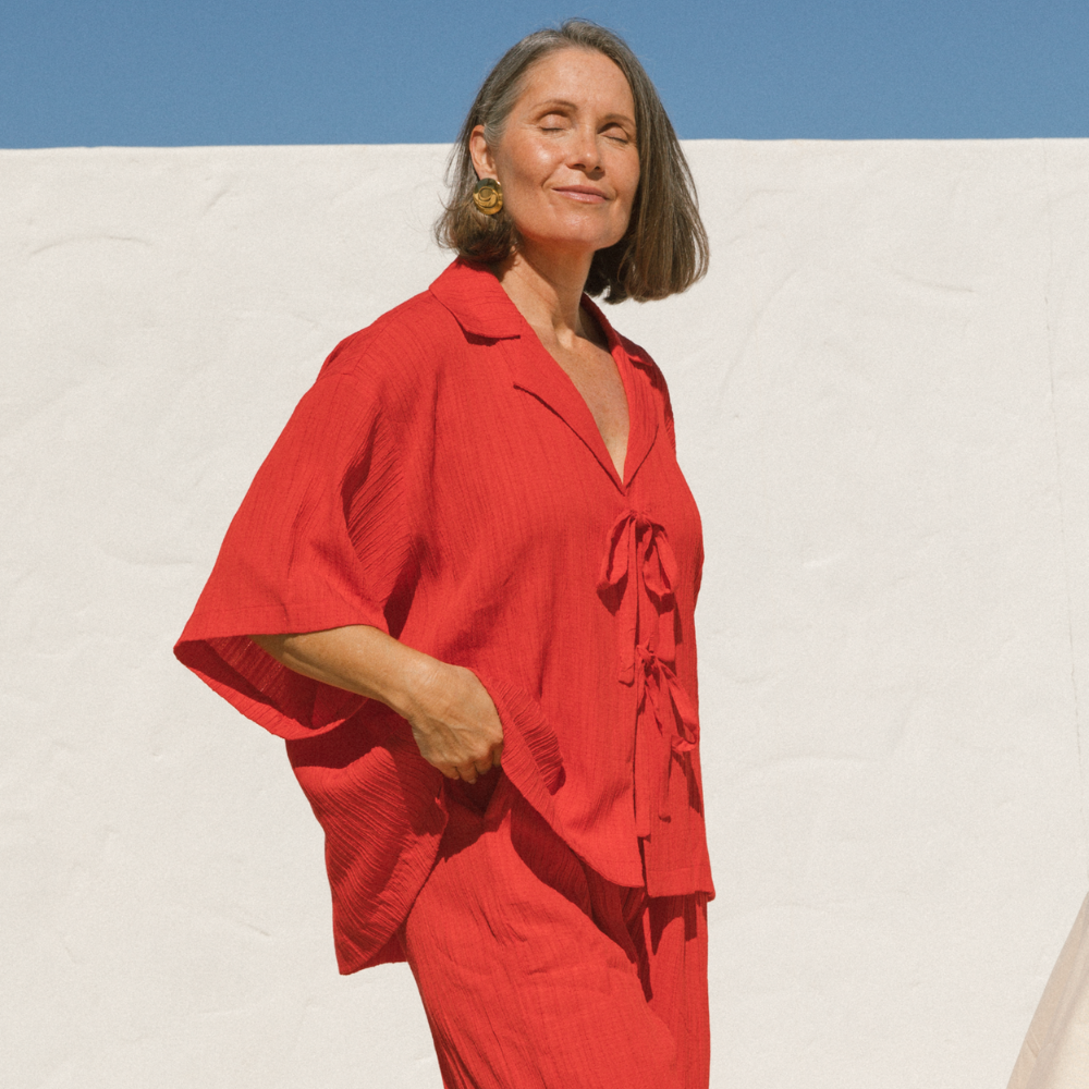 I am new to wearing red clothing as I have copper hair but the red crepe is to DIE FOR. The colour is so bright and the material is incredibly soft. I wore the shirt and crepe shorts to a hens and I got so many compliments!