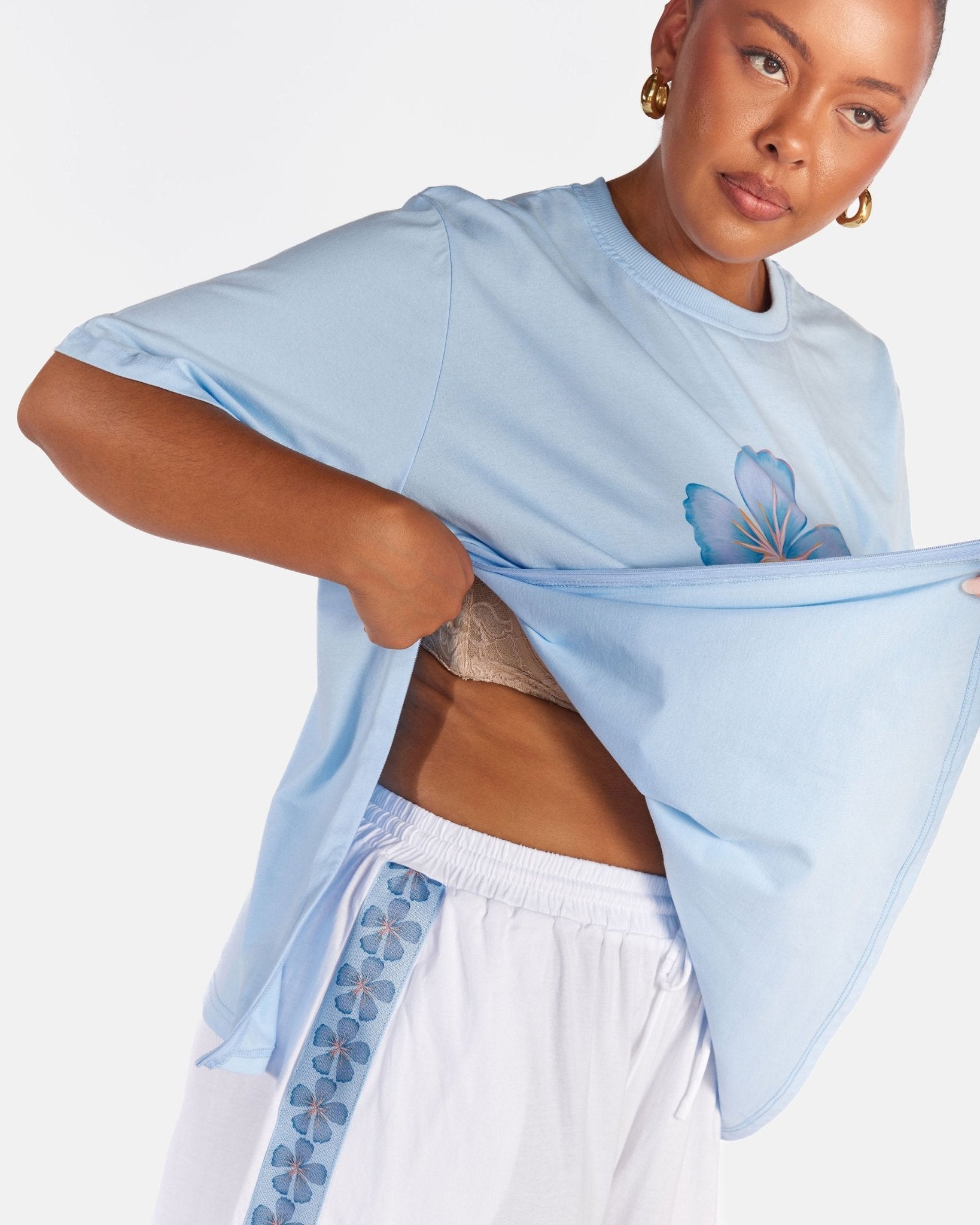 - Jacquard knit side panel with blue floral and white accent detail