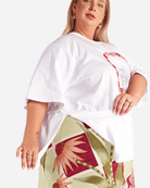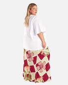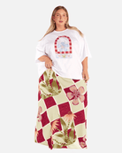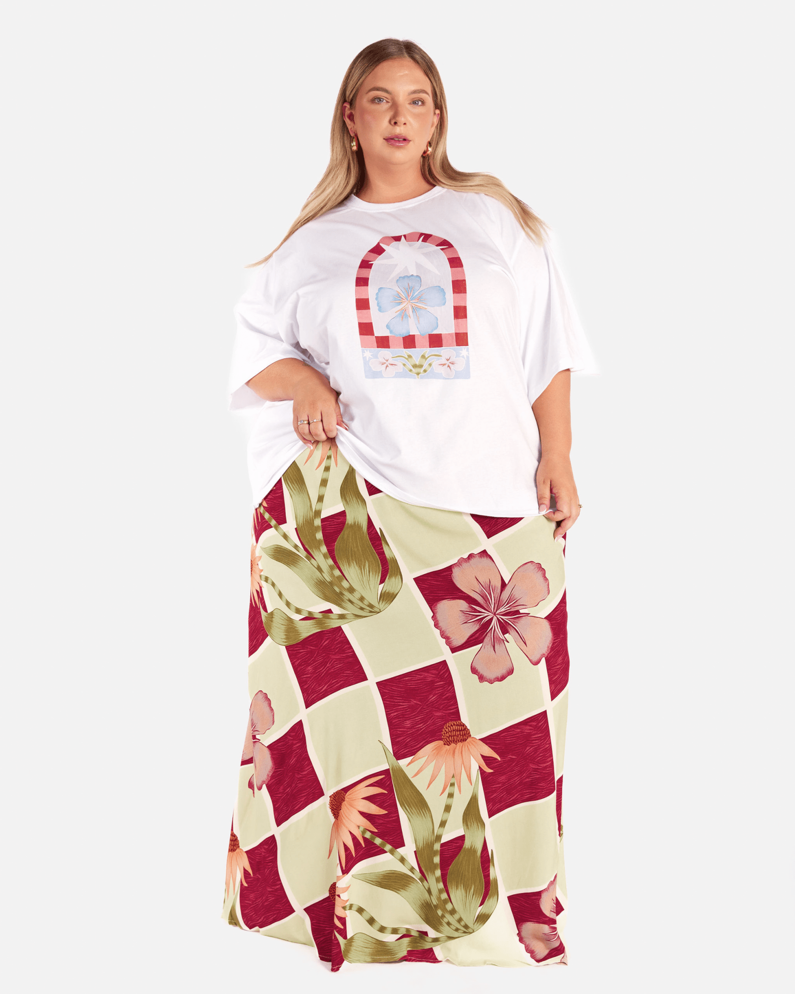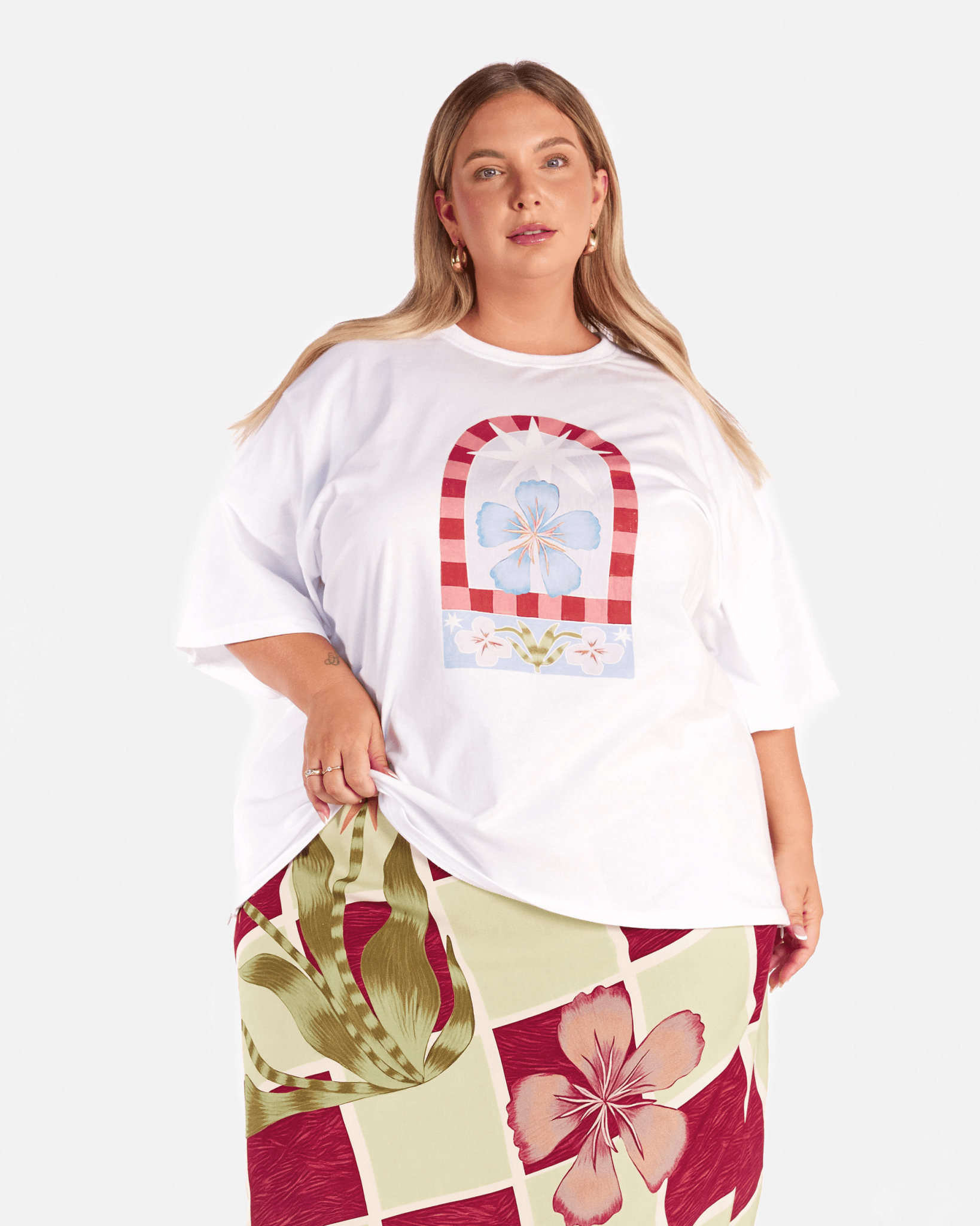 The Vistafleur print is a hand drawn placement design by Art by Saint, inspired by vintage florals and dreamy colour stories. Set on a crisp white base, the print features a soft lavender arch framed by warm red and pink tones, with a bold blue flower at the centre. Finished with pale pink florals, soft green leaves and subtle star details, it feels playful, artistic and easy to wear.