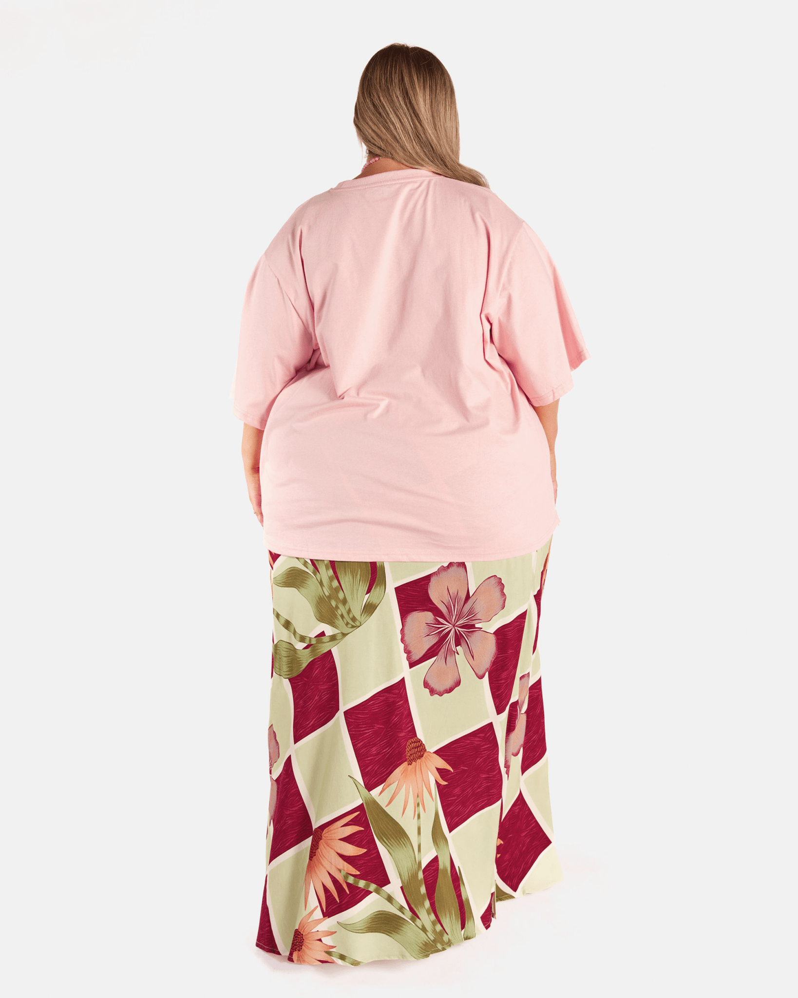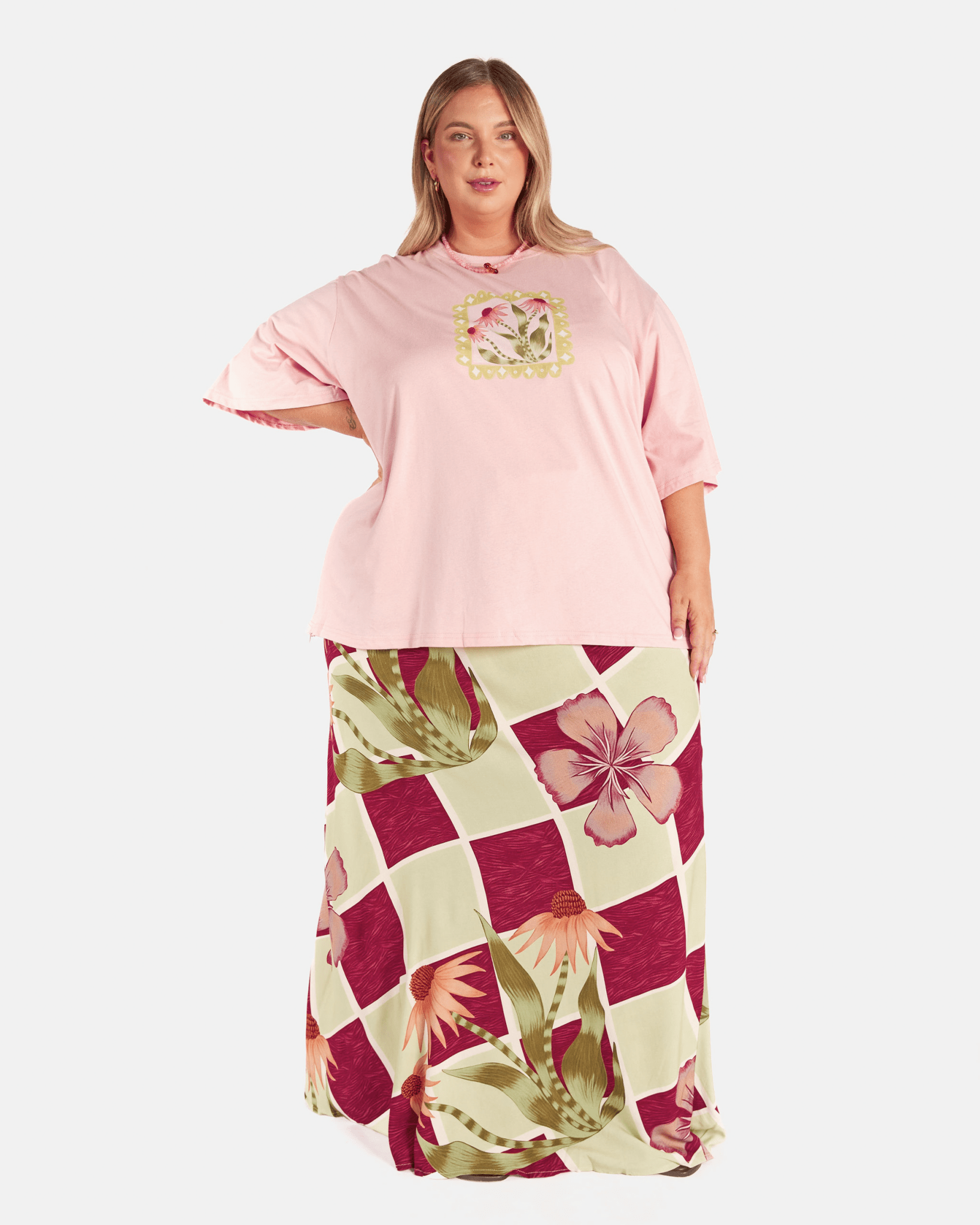 The Wildframe print is a hand drawn placement design by Art by Saint. Set on a soft, warm pink base, the print features illustrated florals in muted red and dusty rose tones with deep green leaves. The design is framed with an olive green scalloped border and subtle white detailing, giving it a vintage inspired, art led feel that still works effortlessly for everyday wear.