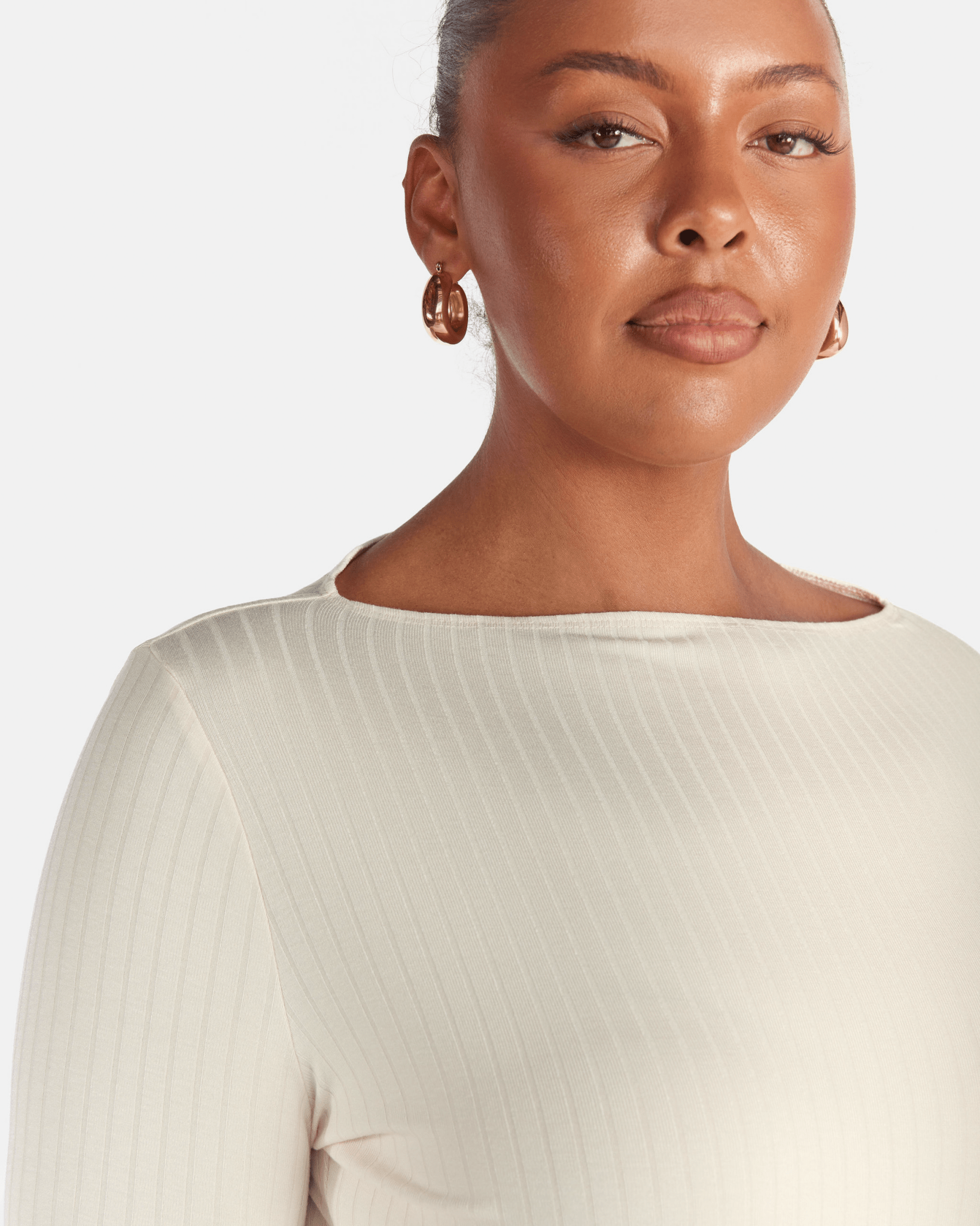 The boat neckline creates a flattering, open shape through the shoulders, while the asymmetrical cut out detail adds subtle shape and visual interest without feeling revealing. It is thoughtfully placed to give definition through the waist and elevate a classic long sleeve.