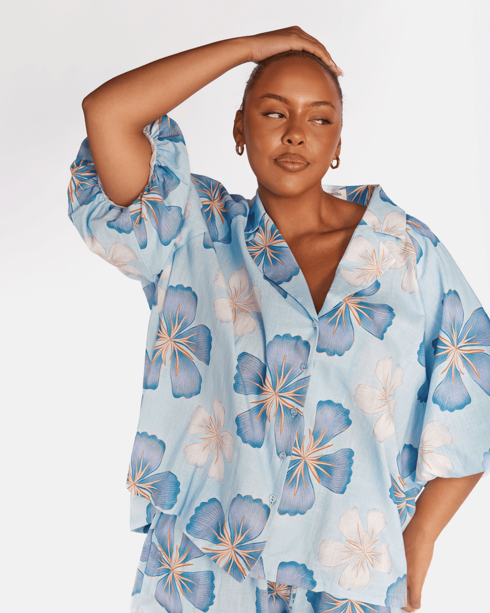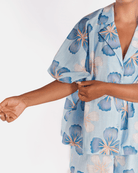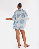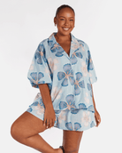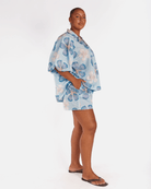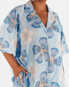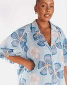 The Daydream print is a hand drawn design by Art by Saint, set on a baby blue base with dark blue and white florals, finished with a mustardy rust coloured centre. It is playful, soft and easy to wear, the kind of print that works for everyday without feeling boring.
