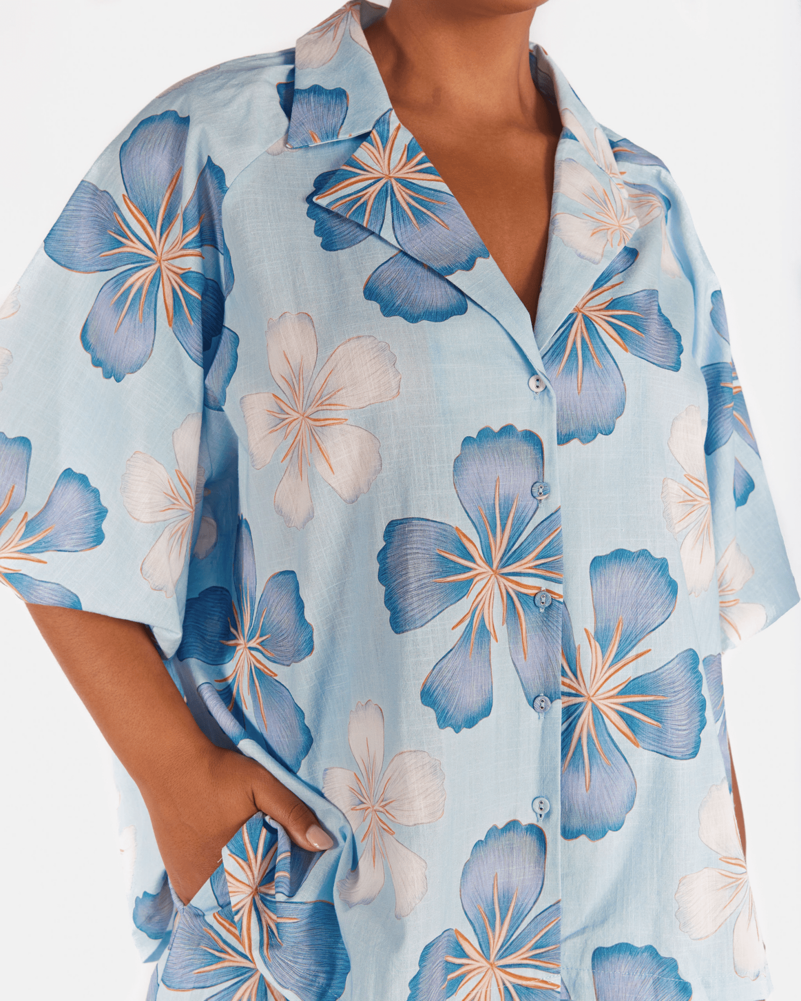 Made from 100% cotton slub, the fabric is breathable, lightweight and softly textured for that relaxed, lived in feel. It is unlined for an airy finish and designed with an intentionally oversized fit that drapes beautifully without clinging.