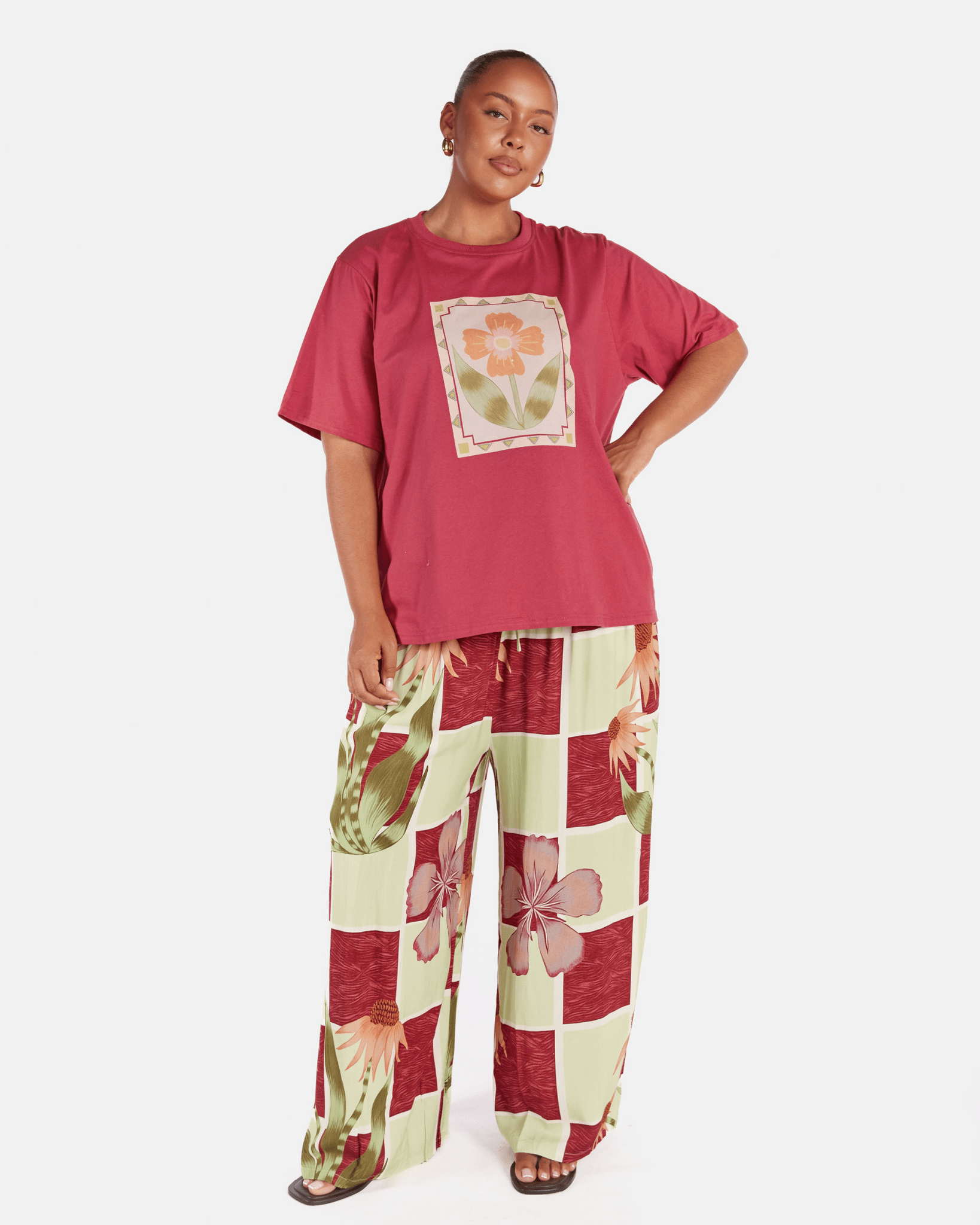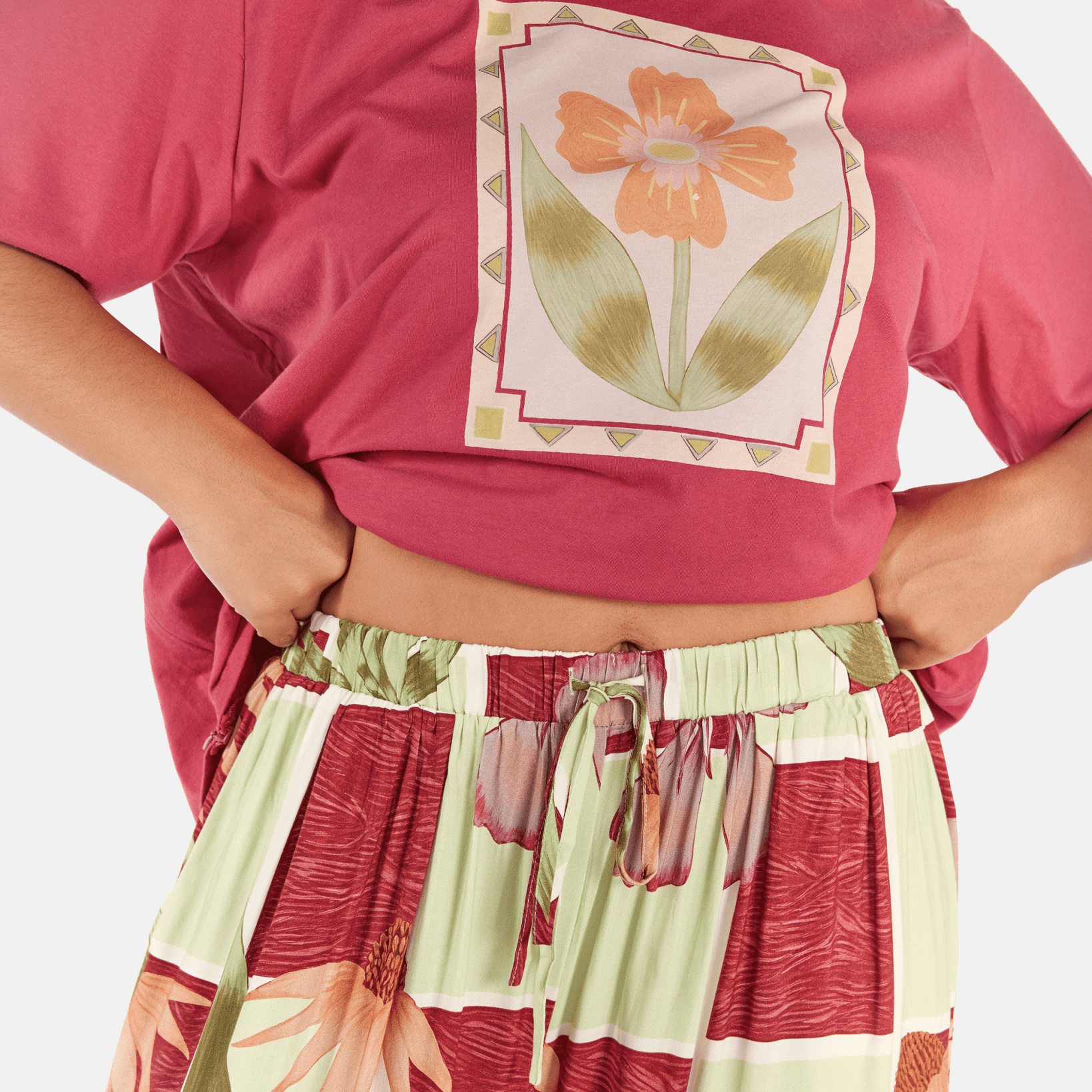 The Flora Tile print is a custom, hand drawn design by Art by Saint, featuring a floral tiled pattern in earthy green, maroon and rust tones. It feels bold but wearable, adding interest to your outfit while still being easy to style.