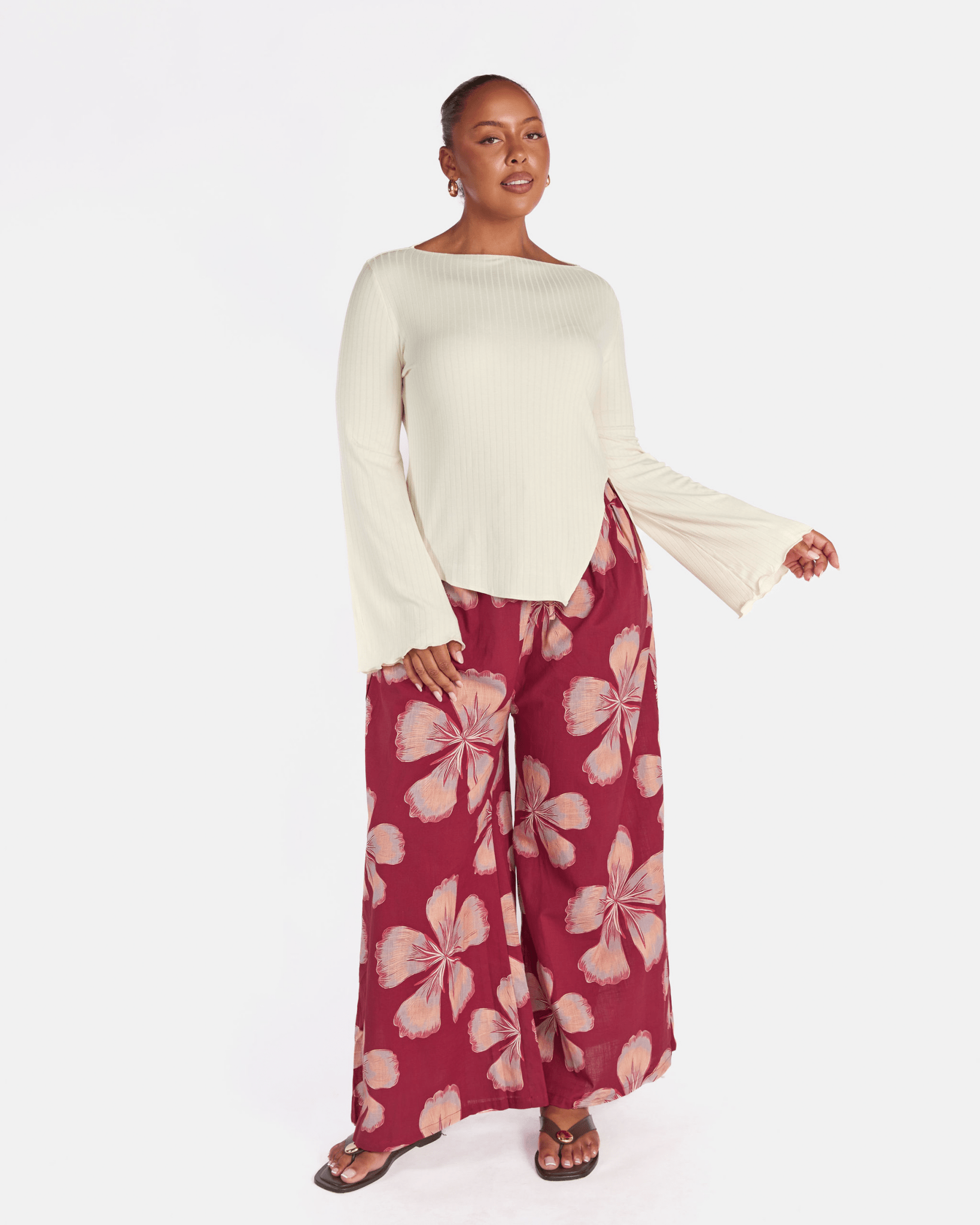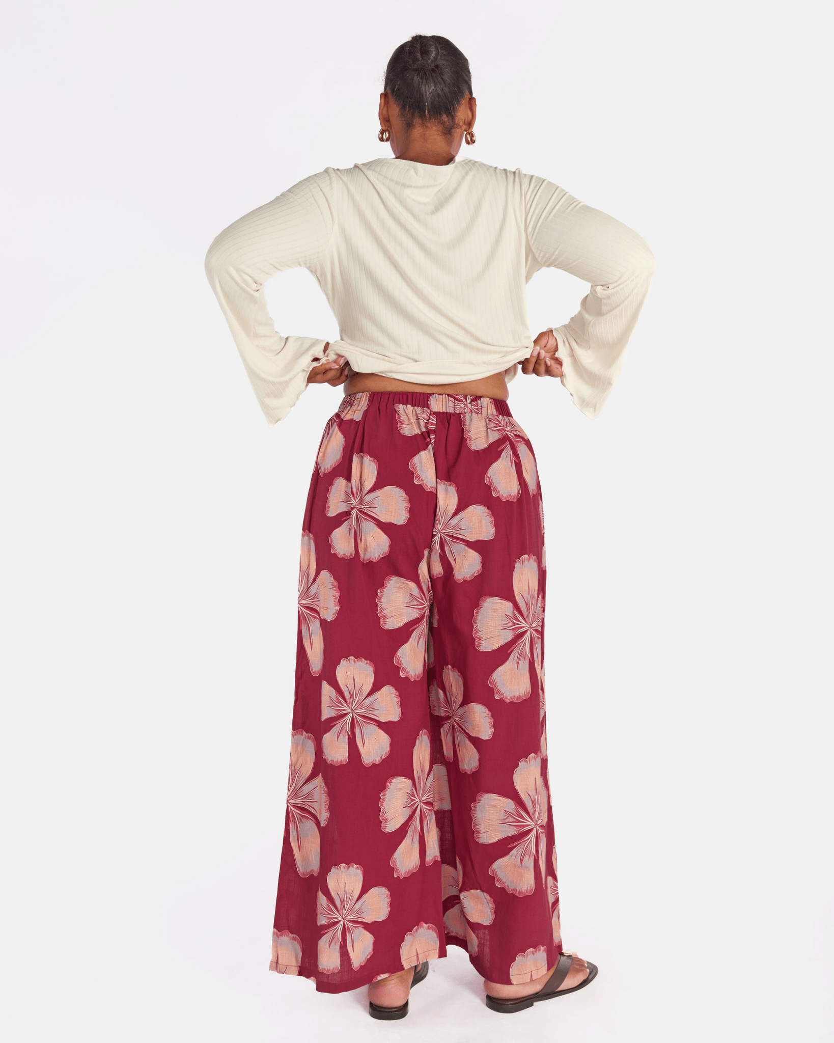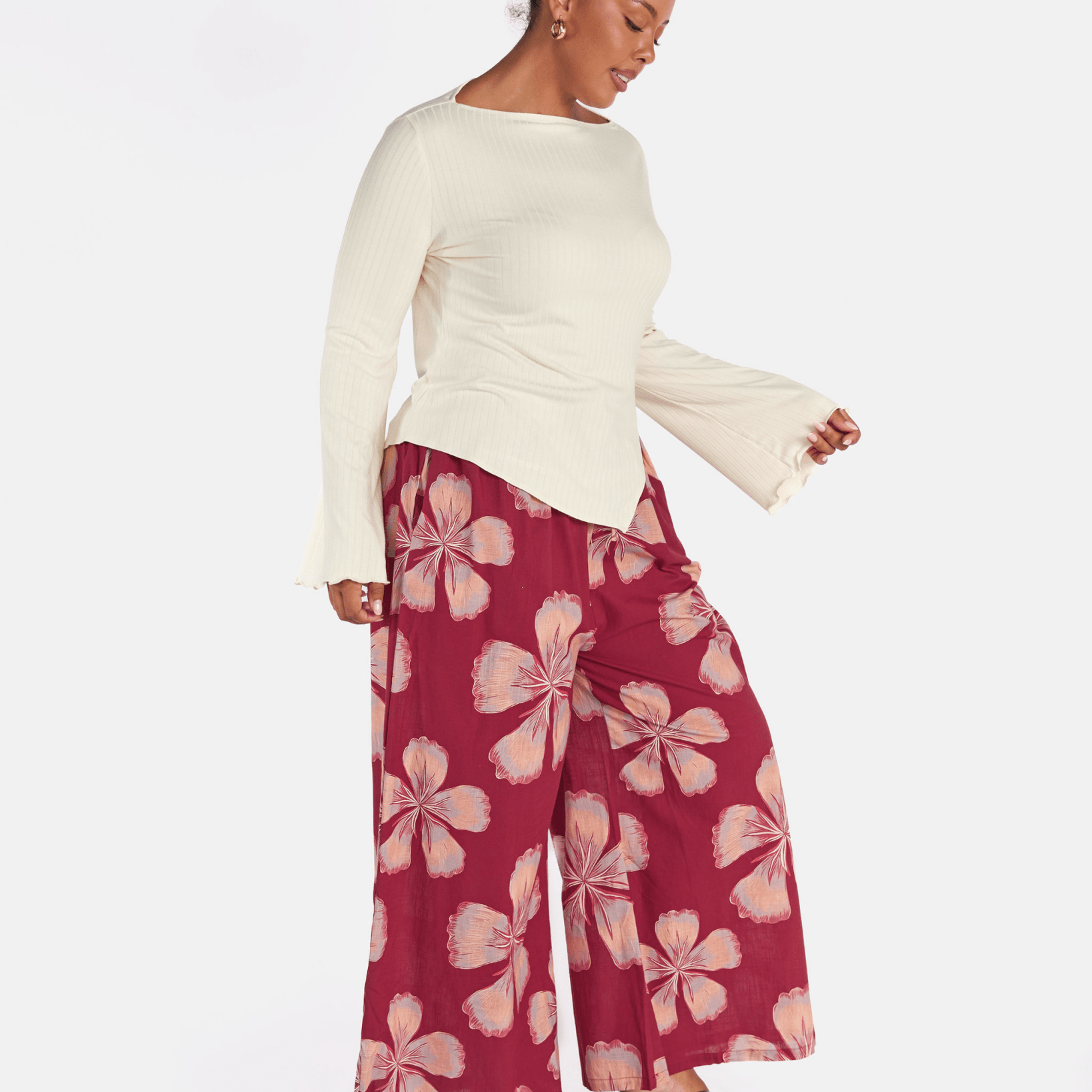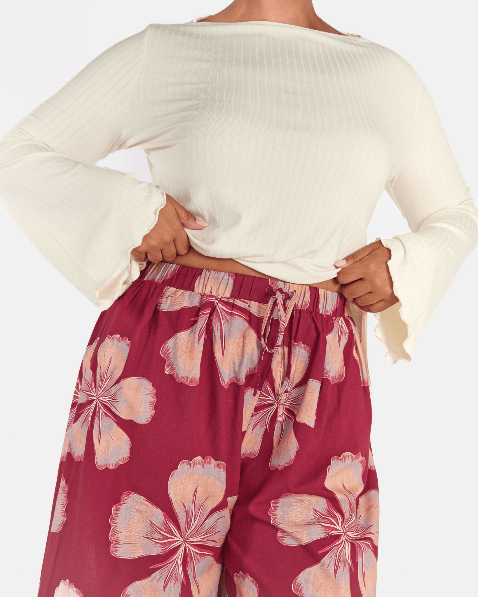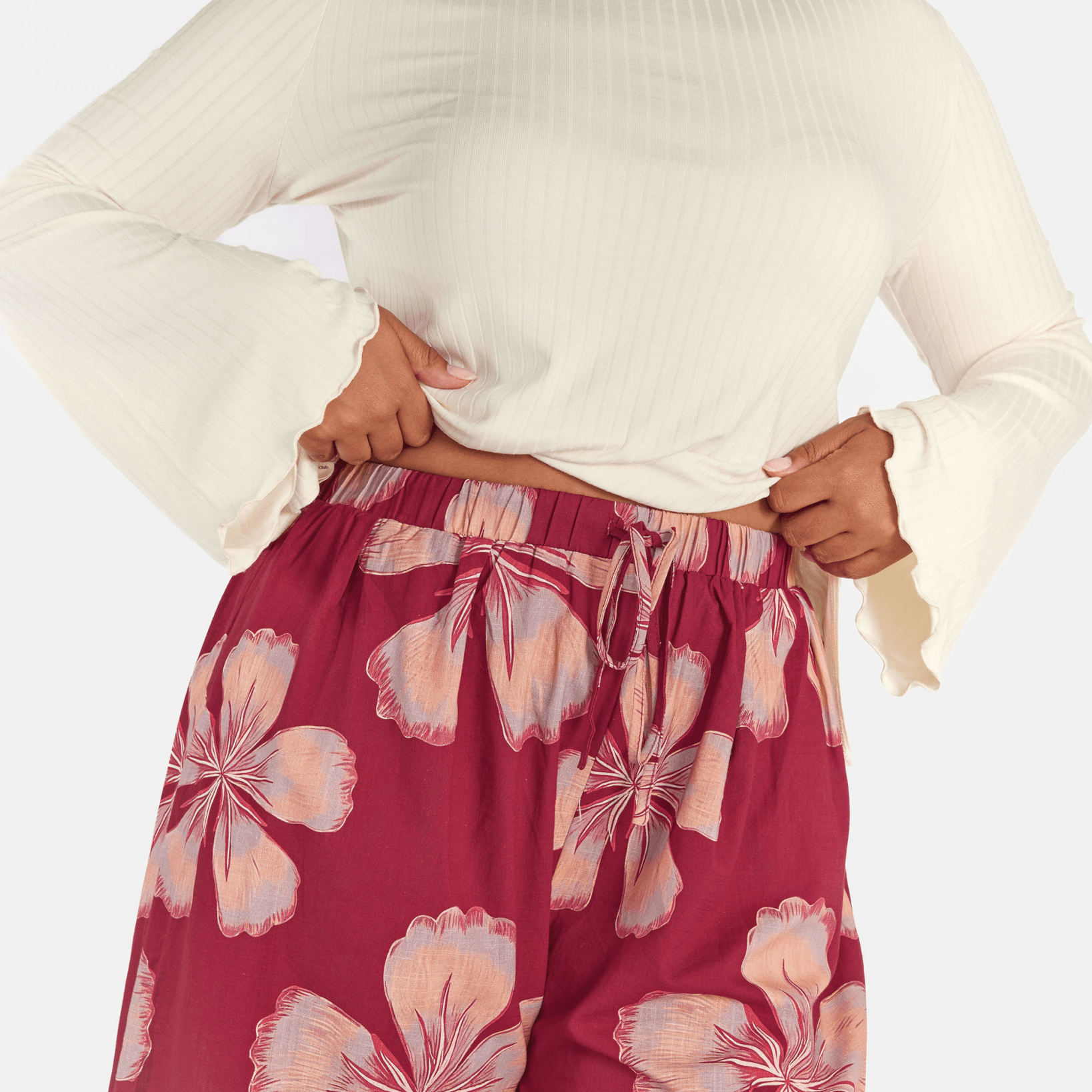 The exclusive Midnight Bloom print showcases oversized hand drawn florals set against a rich maroon background. Soft peach and blush tones bloom across the fabric, creating a warm, bold statement that still feels effortless and wearable.