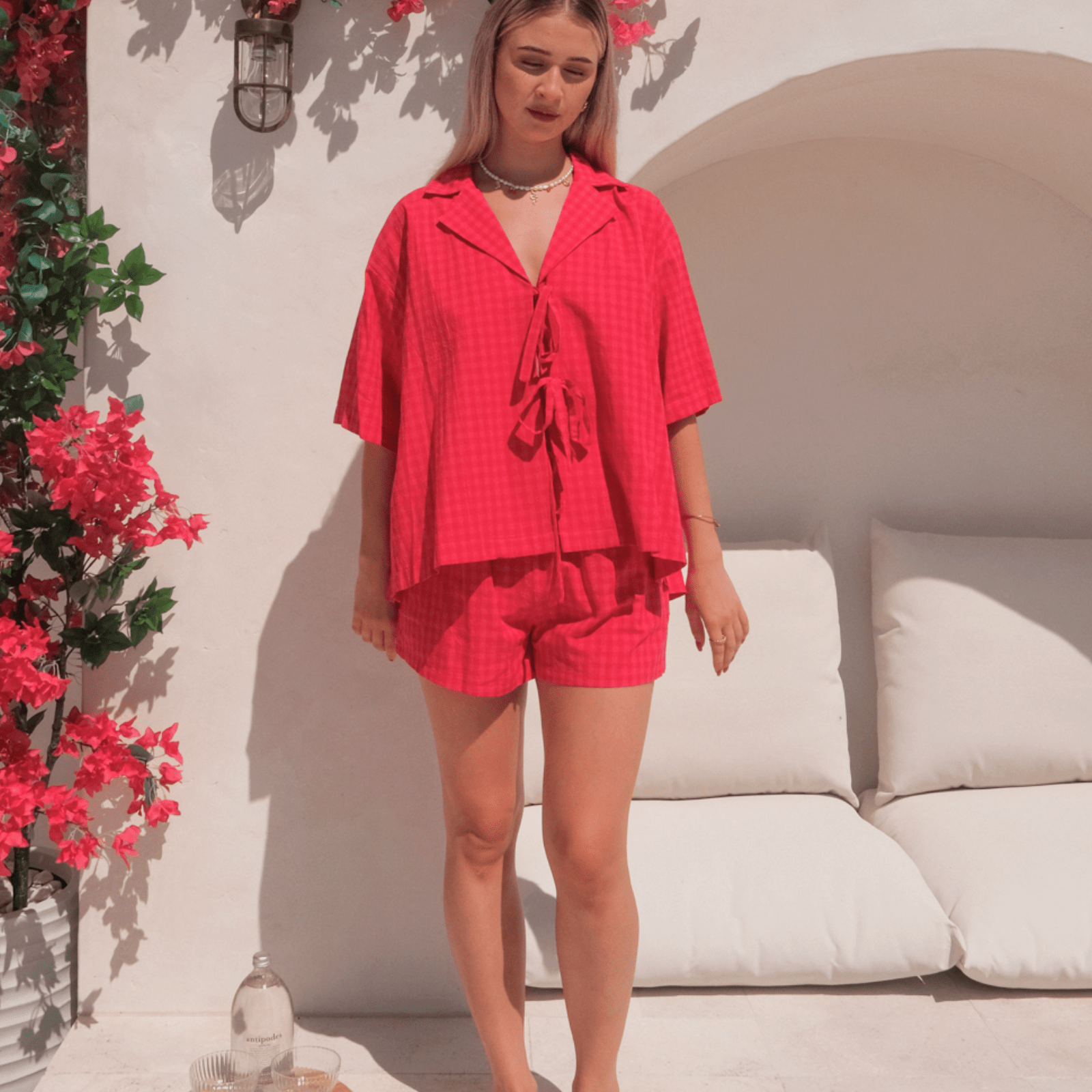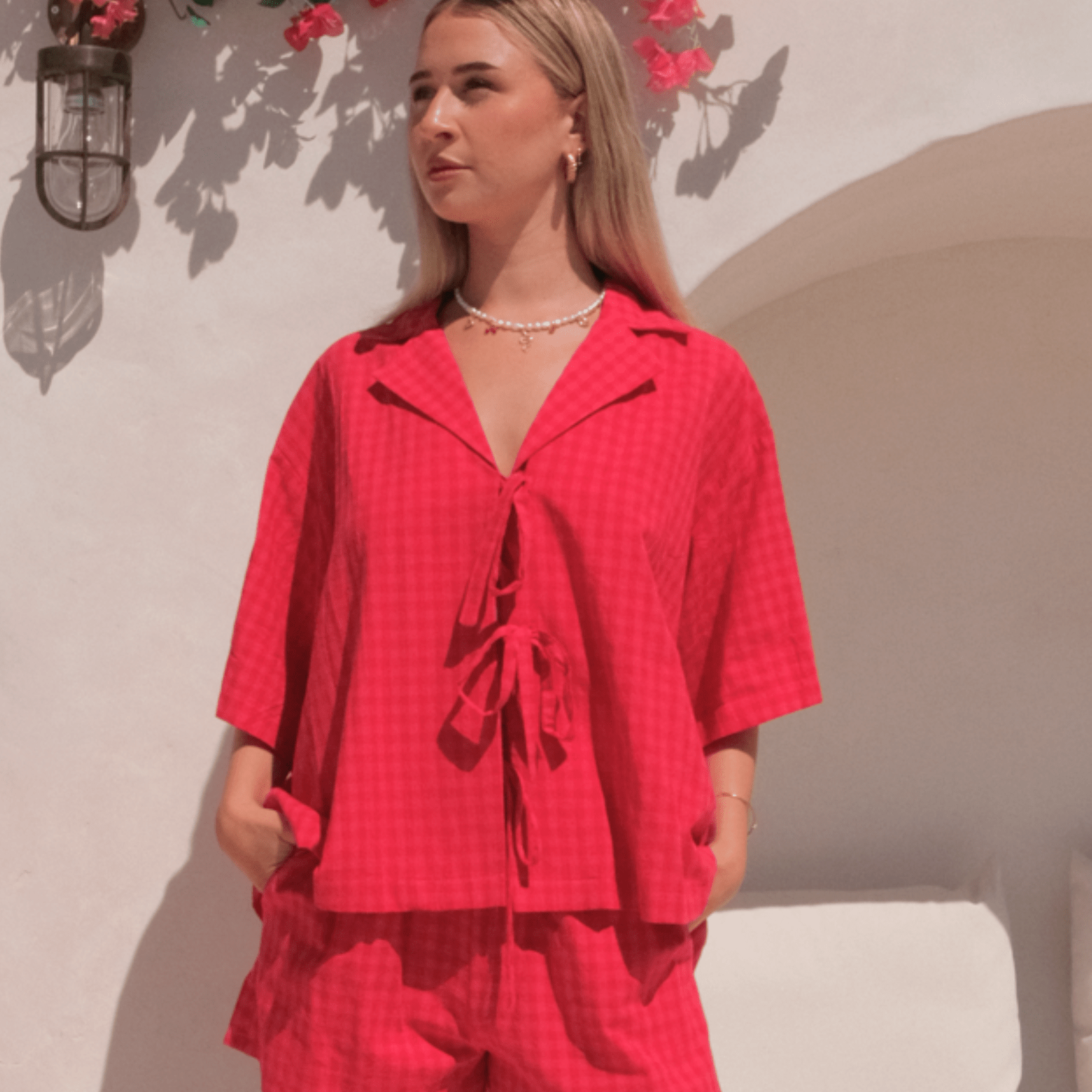 Whether you're lounging at home, running errands, or styling it up for an effortless look, the Billie Shirt is the perfect wardrobe staple. The tie-front closure adds a stylish touch, while its versatile design makes it easy to dress up or down. Pair it with our Posey Pants for the ultimate laid-back yet put-together outfit.