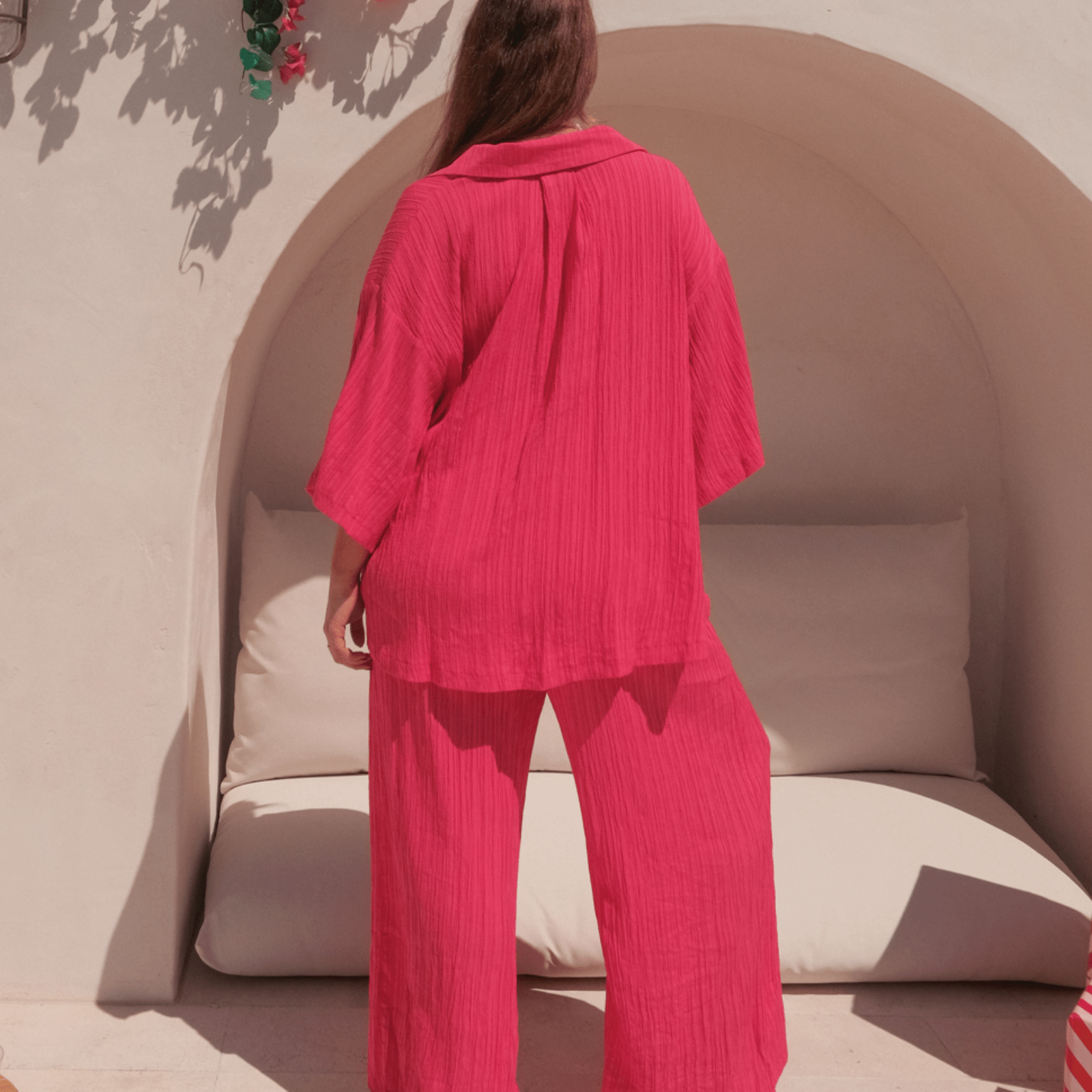 Our Crepe styles are crafted from a beautiful, breathable blend designed for comfort and elegance. Due to the nature of the loose weave, this fabric is more delicate than our cotton and linen pieces and requires extra care to maintain its quality and longevity.