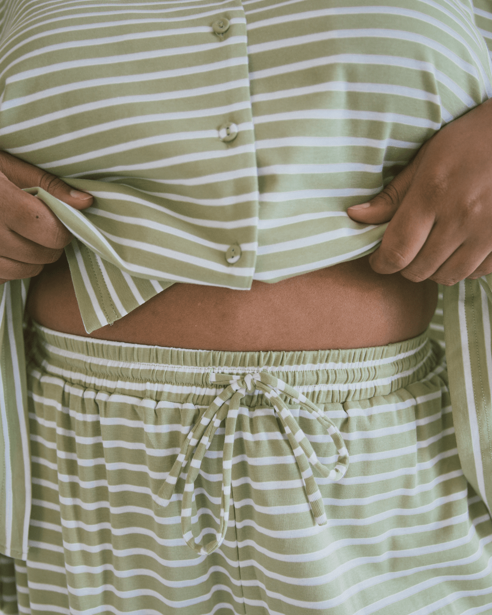 The soft green stripe gives them an easy going, coastal feel that works for lounging at home, running errands or styling up with the matching shirt for a full set moment that looks cute with zero effort.