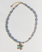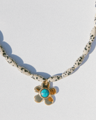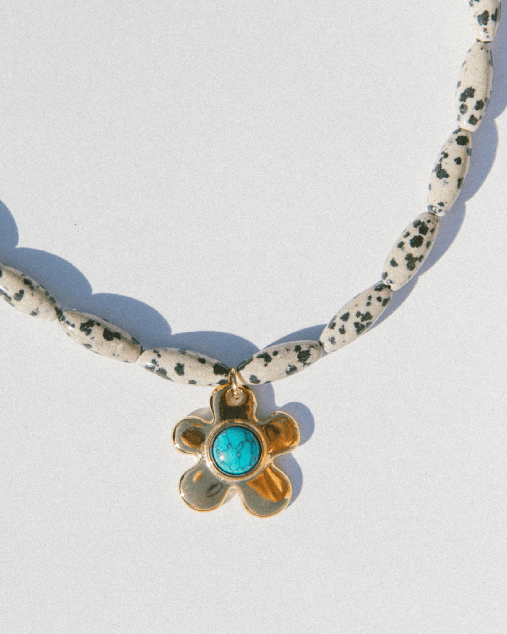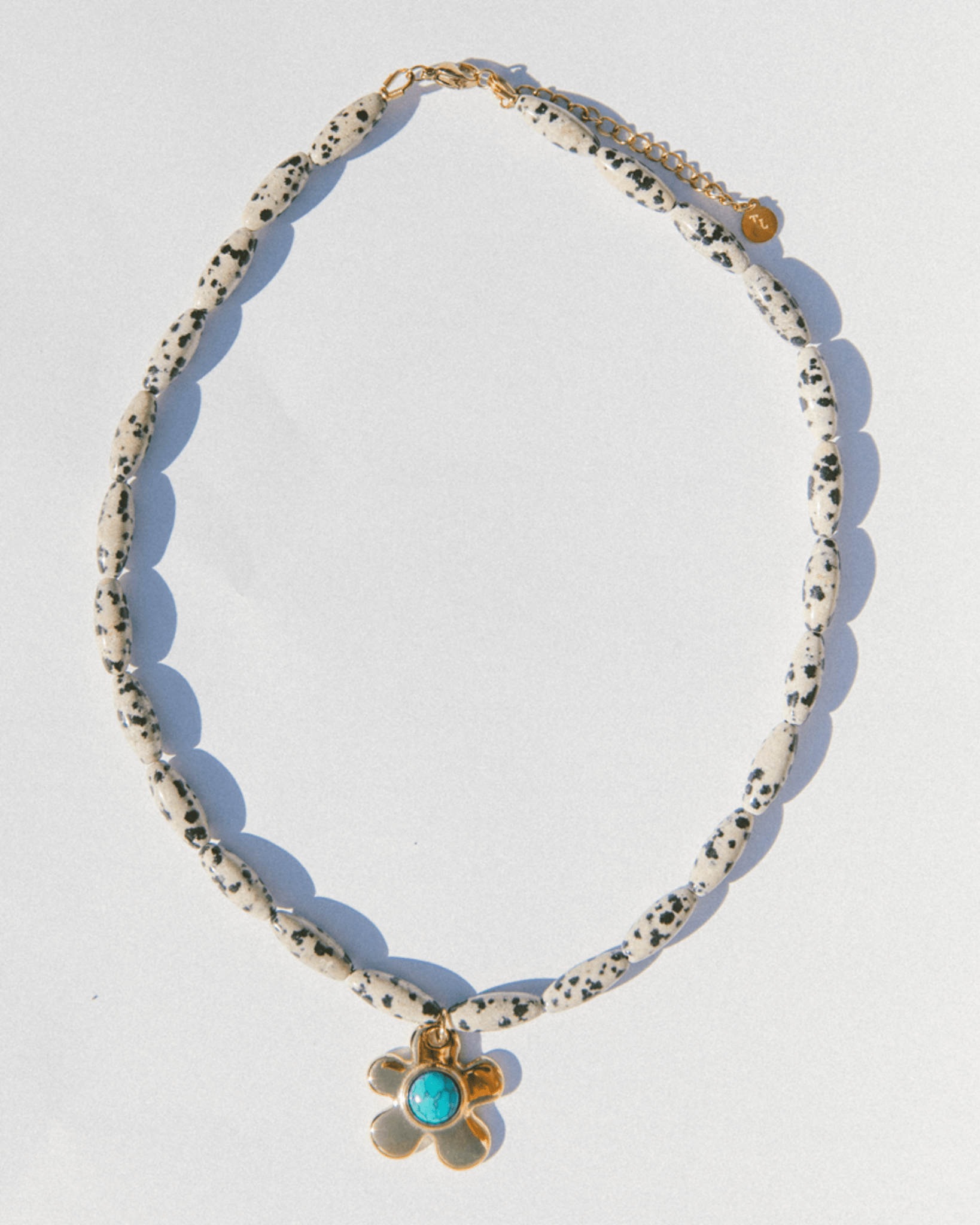 Featuring speckled stone beads and a gold flower charm with a pop of turquoise at the centre, Esmé brings a relaxed, feel good vibe that works just as beautifully with lounge sets as it does with your favourite dress. It feels nostalgic in the best way, like something you have always loved, even if it is brand new.