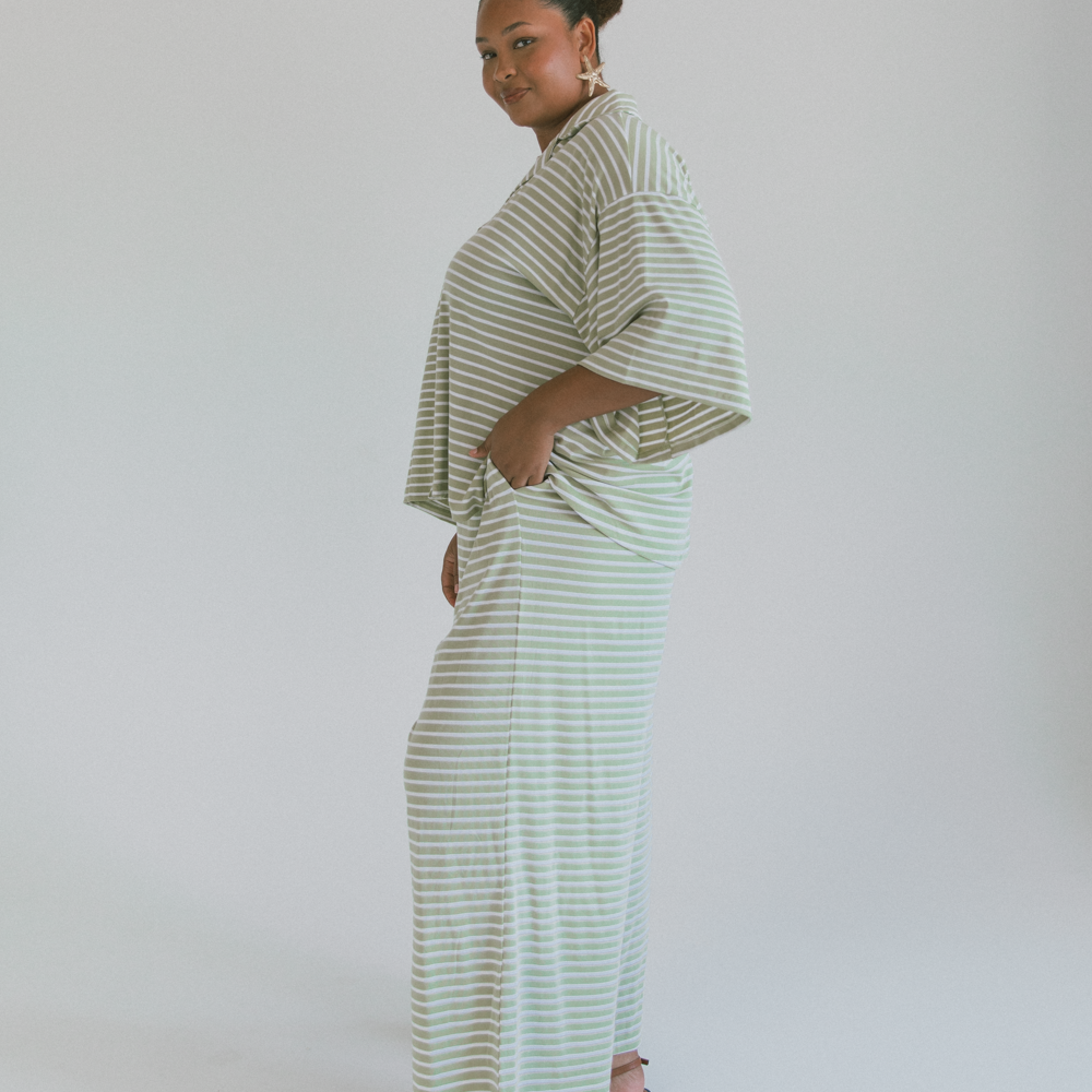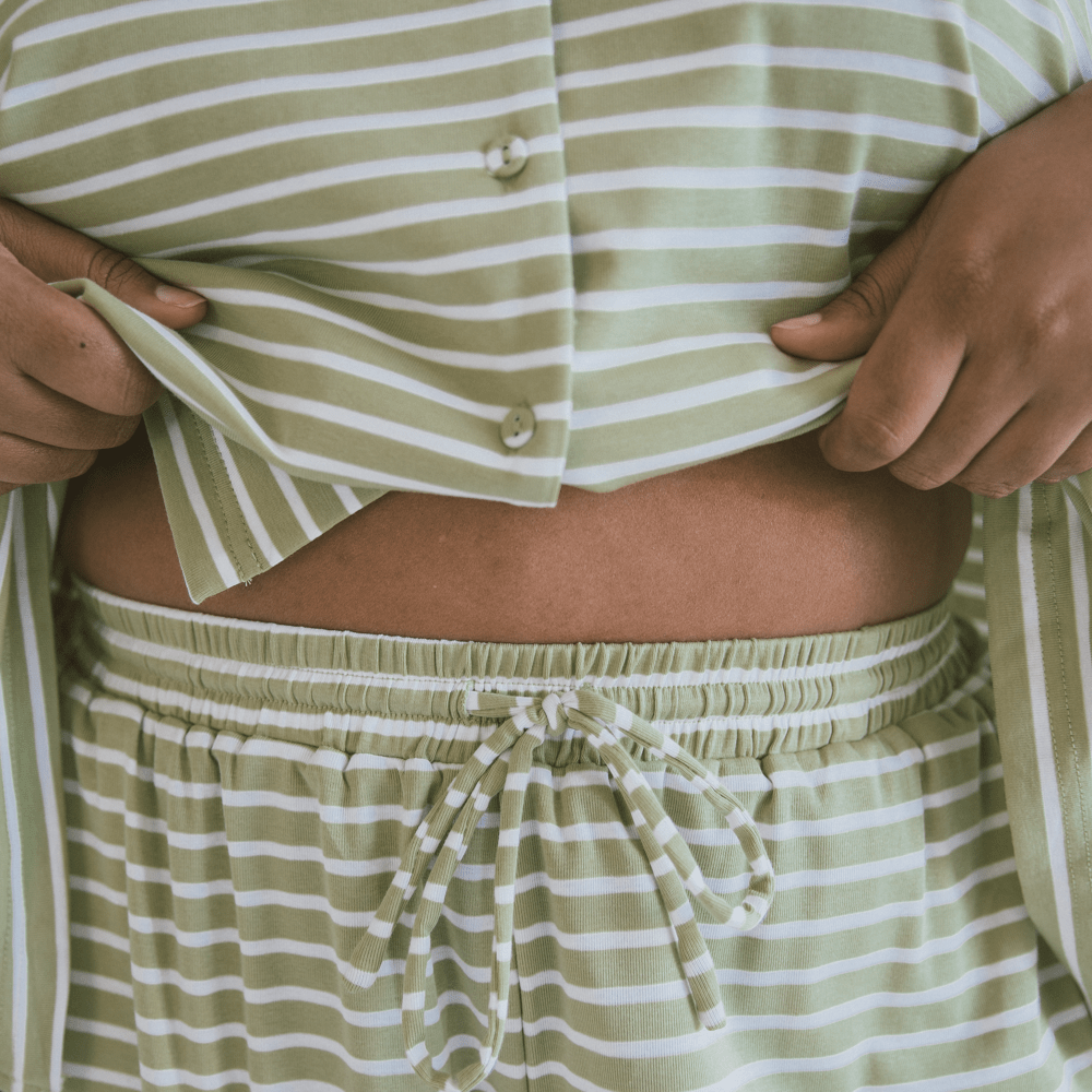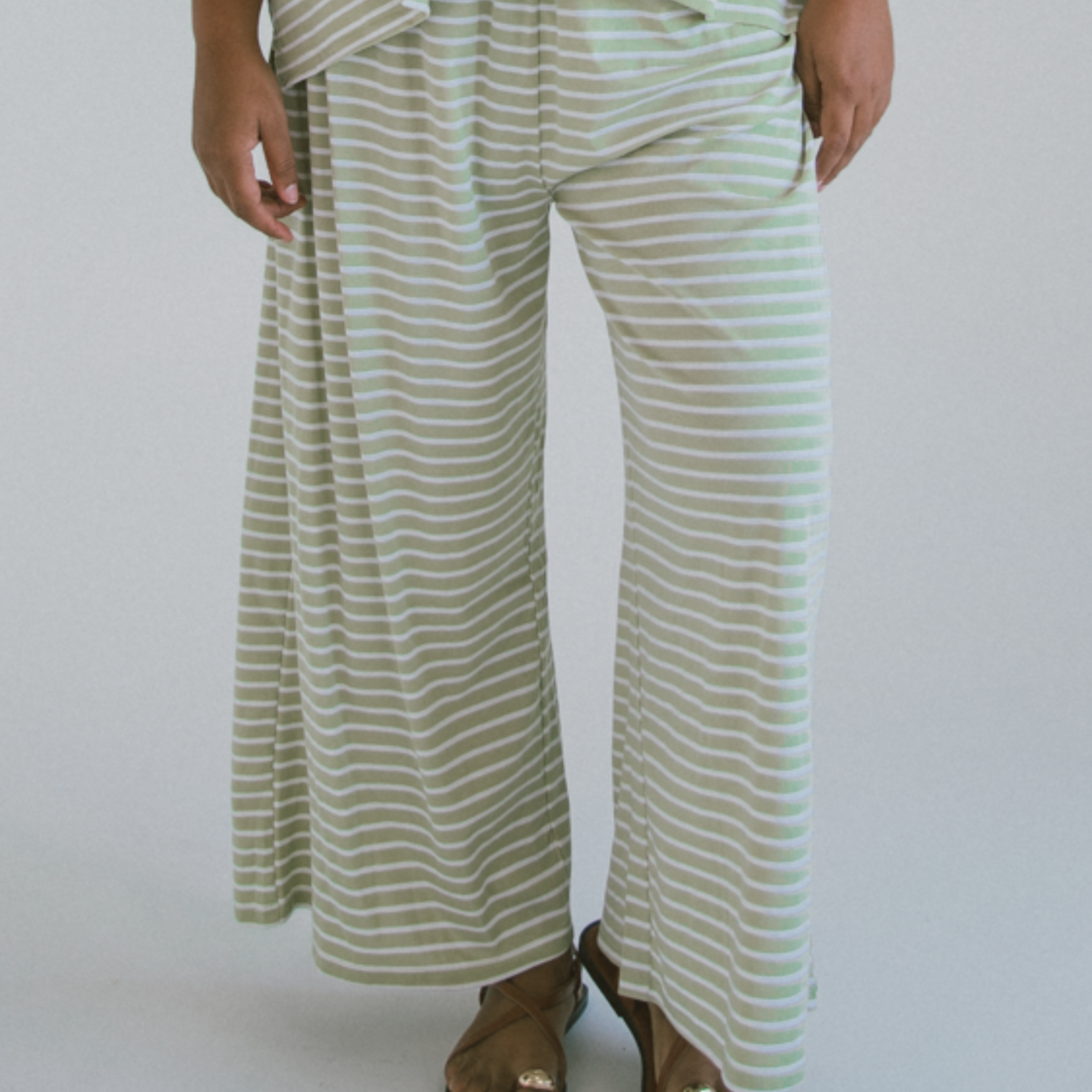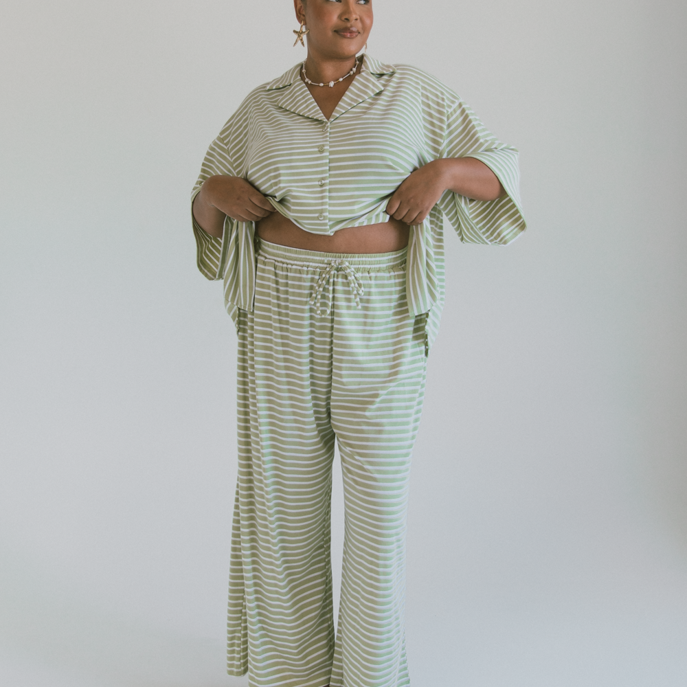 The soft green stripe gives them an easy going, coastal feel that works for lounging at home, running errands or styling up with the matching shirt for a full set moment that looks cute with zero effort.