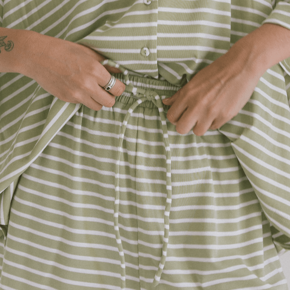 Meet your new throw on, live in, never want to take off shorts. The Essentials Shorts in Green Stripe are made from our ultra soft 92% Tencel and 8% Spandex blend, giving you that cool, breathable, stretchy comfort that feels good from morning to night. If you love the matching Lacey Shirt or the Essentials Pants, these are the cute little sister you absolutely need.
