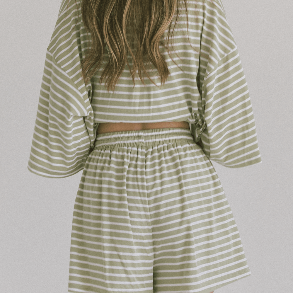 The soft green stripe has that calm, coastal feel and pairs perfectly with the matching tee or shirt for the full set moment. Cute, coordinated and absolutely effortless.