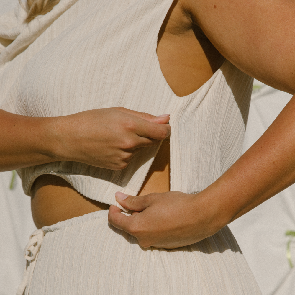 Hidden side seam zippers give you easy, discreet access when feeding your little one — no awkward outfit changes needed.