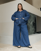 Style it your way — buttoned up with our wide-leg denim pants for a matching moment, or thrown over soft cotton pants and slides for that effortless, everyday vibe.
