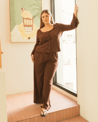 The Ava Top is your go-to for those slow, soul-soothing mornings or easy days spent lounging around. Crafted from soft cotton pointelle fabric with just the right amount of stretch, it’s light, breathable, and oh-so-gentle on the skin. With a relaxed fit, cute lettuce-edge hems and a functional button-up front, this piece layers beautifully over bralettes or nursing crops—making it a quiet hero for breastfeeding mamas too.