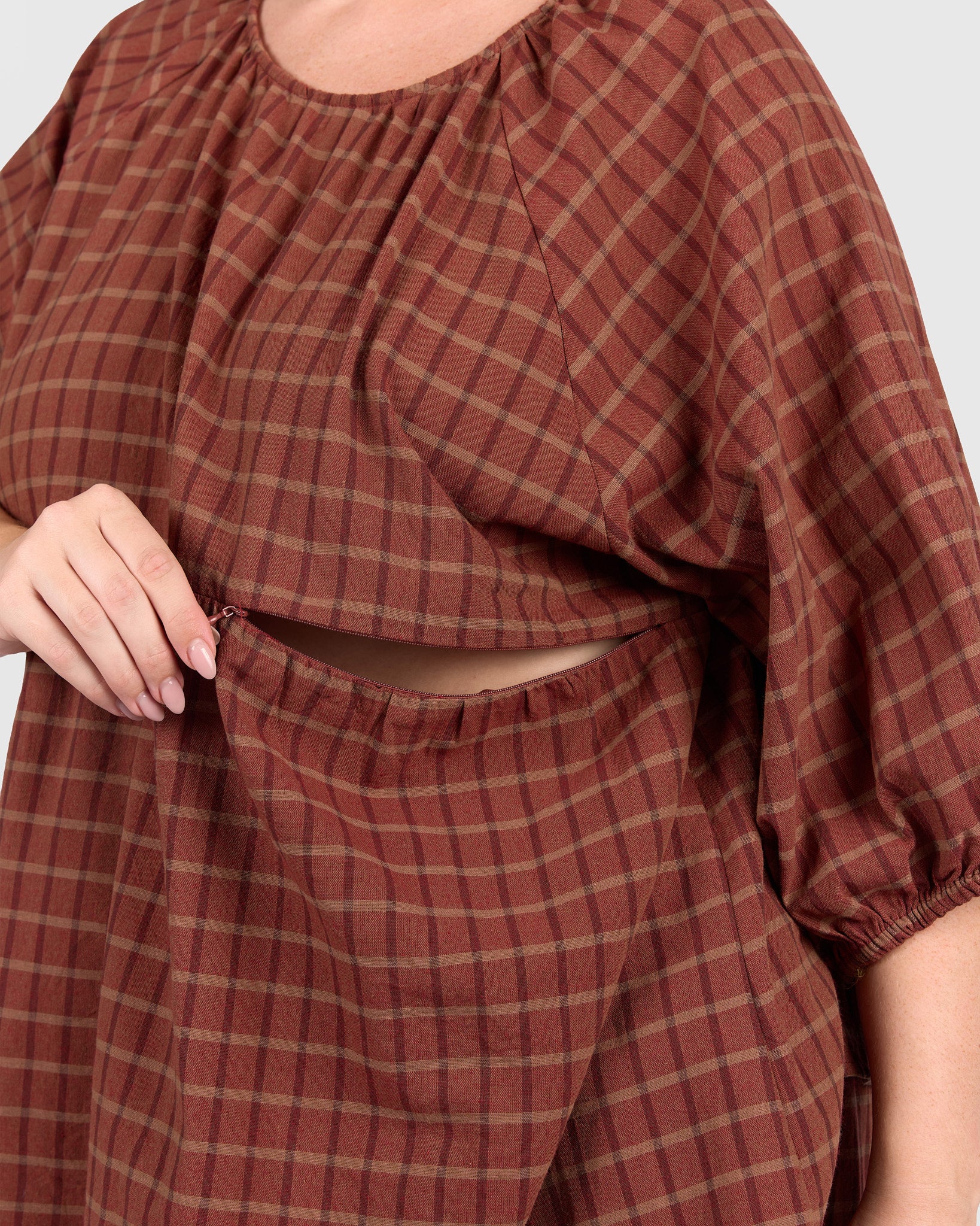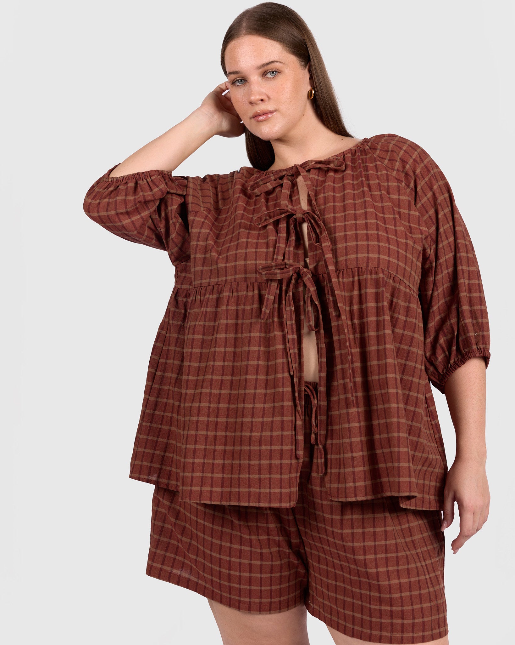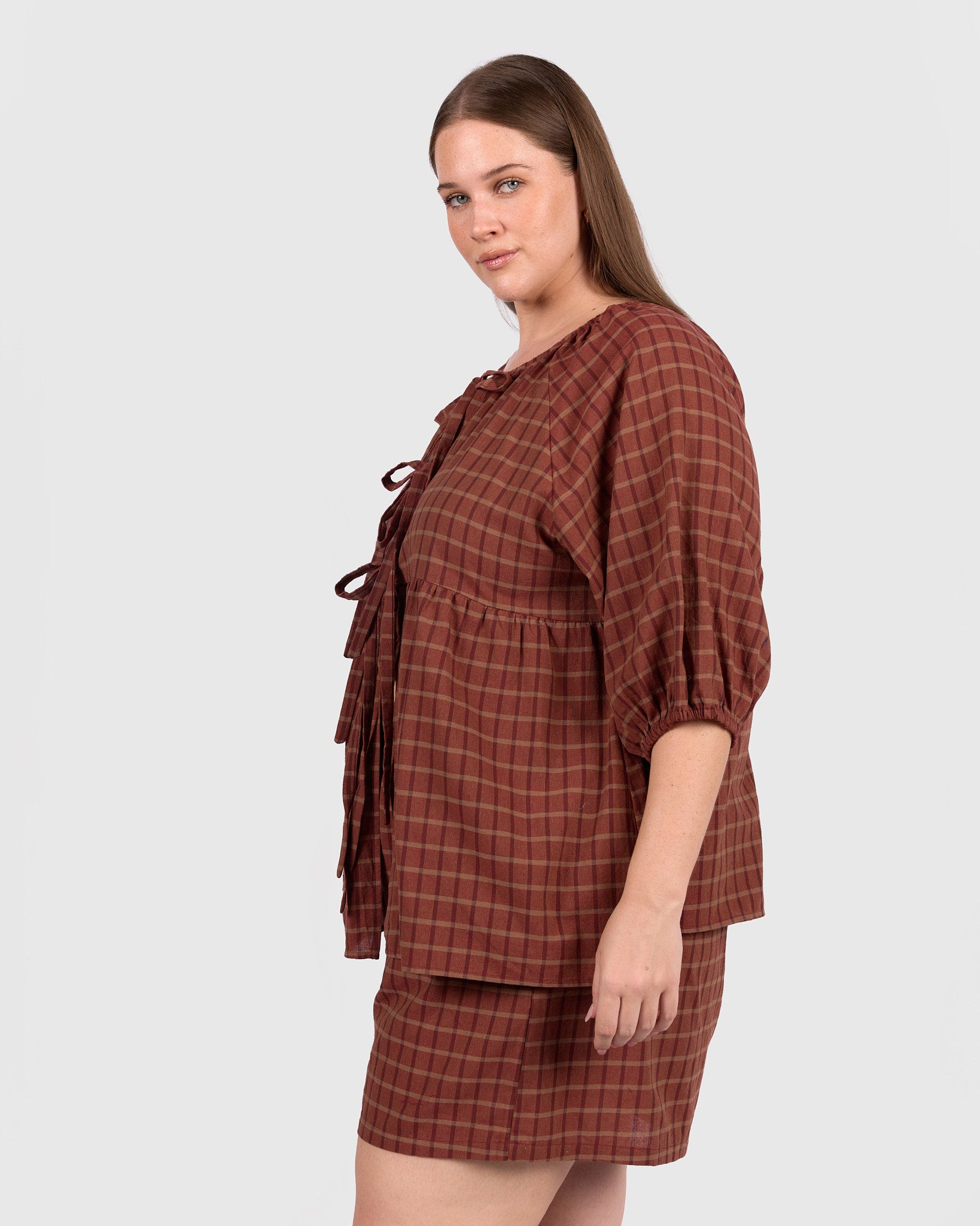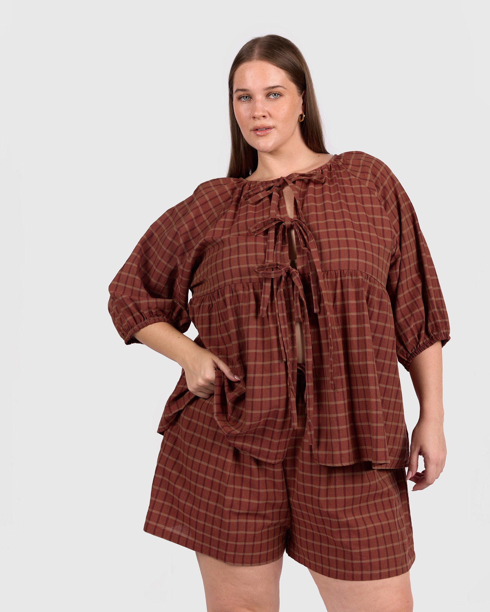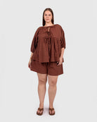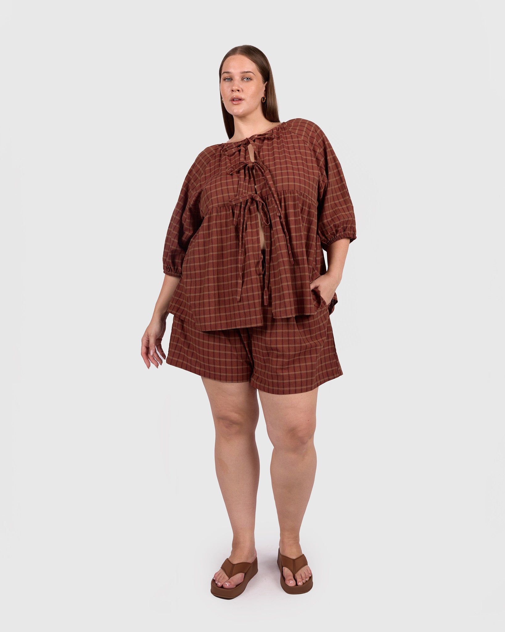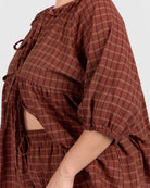 The Maple Gingham print brings a warm, classic feel that pairs effortlessly with denim, wide-leg pants, or matching gingham separates. It is the kind of print that never dates and works beautifully across seasons.