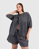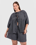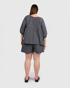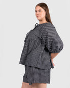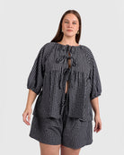 The Florence Top in Midnight Gingham is the ultimate blend of timeless print and thoughtful design. Crafted from a breathable 80% cotton and 15% linen blend, it feels lightweight, airy, and naturally textured with that relaxed finish you will love from the first wear.