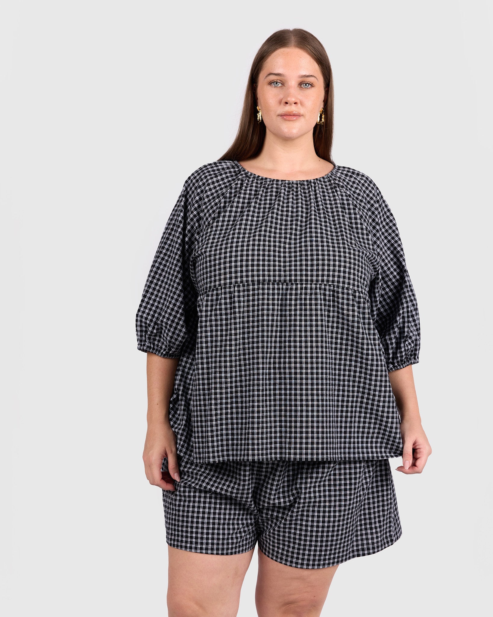 The classic black and white gingham gives this piece an effortless, wear-anywhere feel. Easy to pair with denim, wide-leg pants, or matching gingham separates, it is a staple that works across seasons.