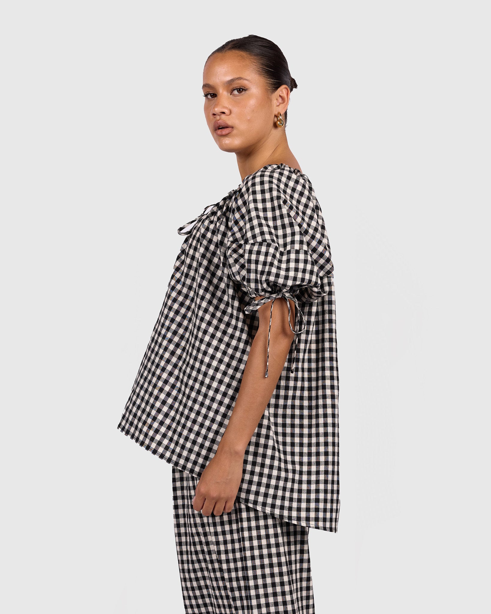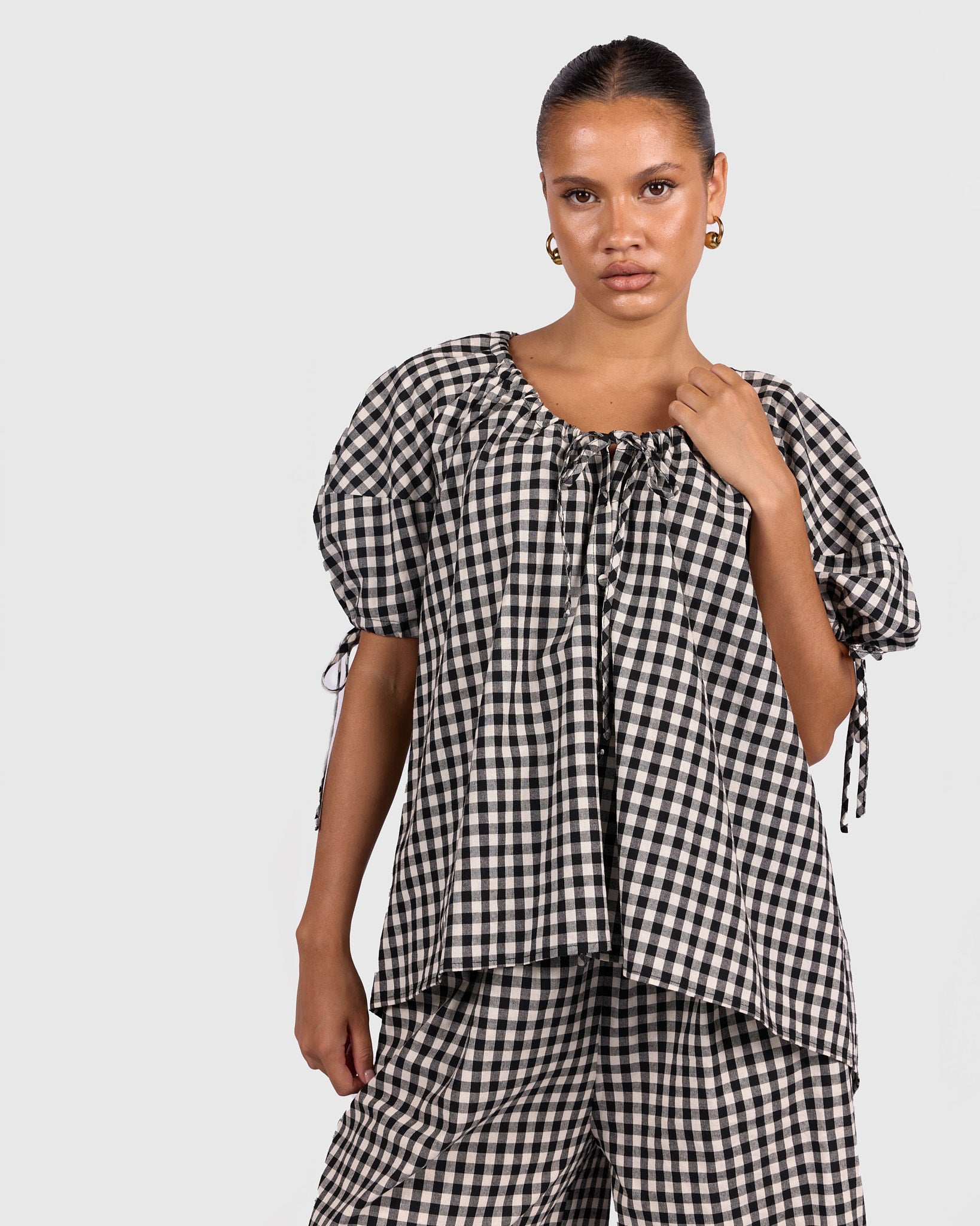 The classic black and white gingham print gives it a timeless, wear-with-everything feel. It is the kind of piece you can throw on with your favourite pants or shorts and instantly feel put together without trying too hard.