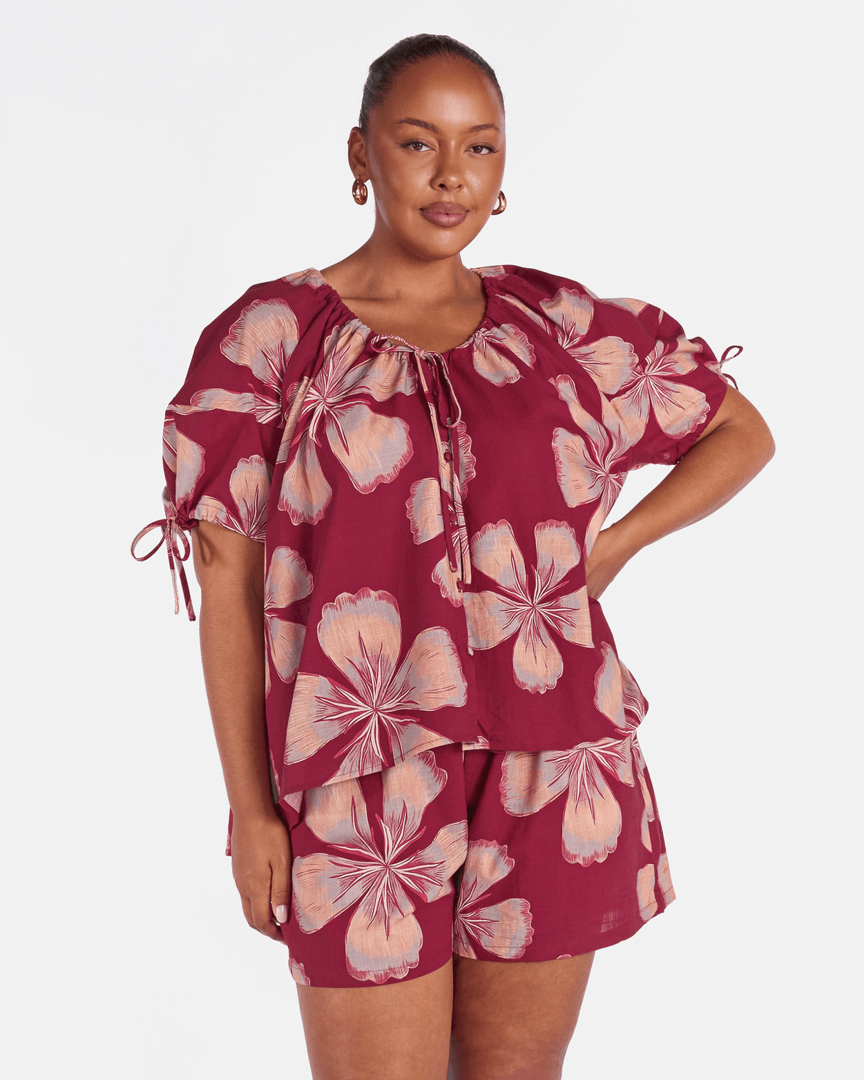 Designed with a soft drawstring neckline, this top allows you to adjust the fit and shape to suit your style. The billowing puff sleeves feature adjustable ties, adding volume while keeping things comfortable. Functional fabric-covered buttons down the front make it breastfeeding-friendly and accessible, while the curved hem with a slightly longer back offers extra coverage where you want it.
