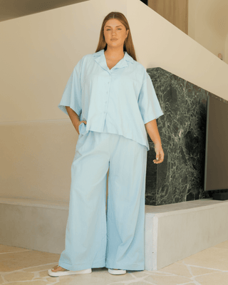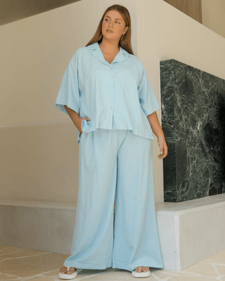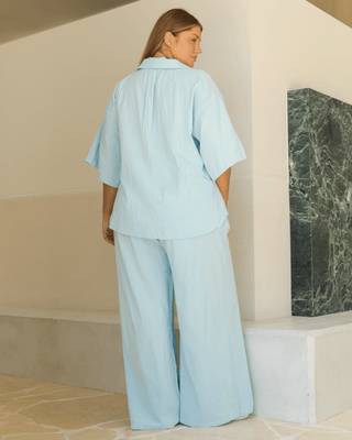 Say hello to laid-back comfort in its softest form. The Lacey Shirt in Light Blue is your everyday go-to for feeling relaxed and put-together. Designed with a breezy, oversized silhouette, this lounge shirt is made to move with you — from slow mornings at home to sun-filled afternoons by the sea.