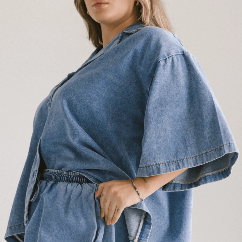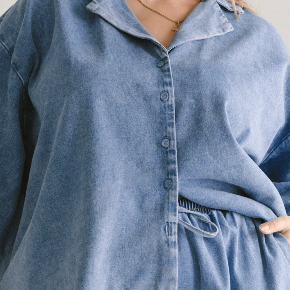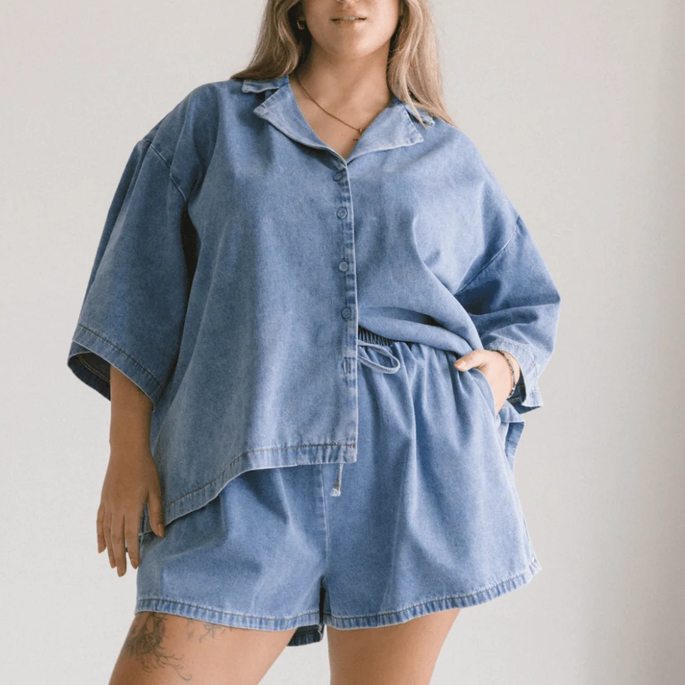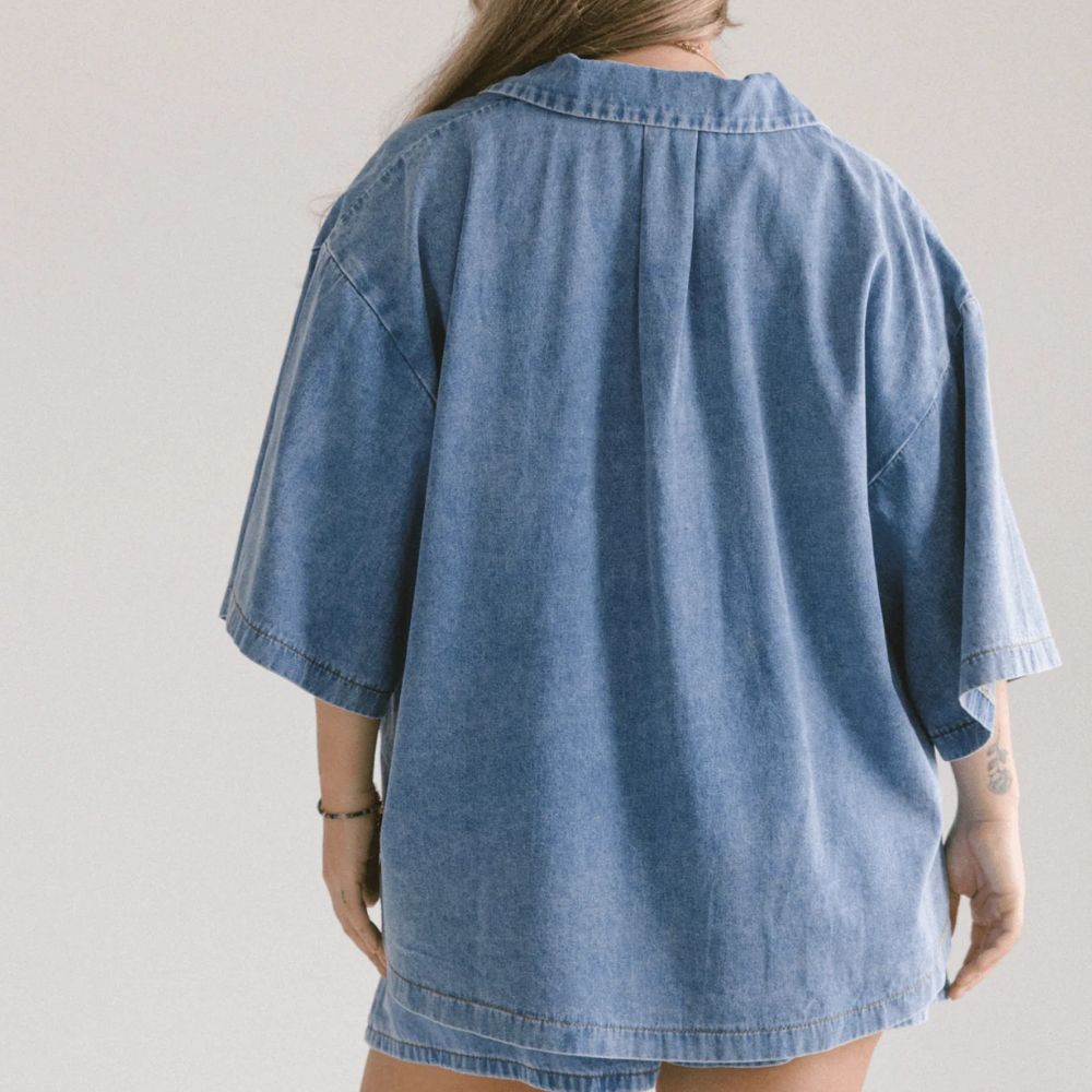 The ultimate "I rolled out of bed but still look cute" shirt. The Lacey Shirt in Light Denim is our love letter to comfy mornings, beachy afternoons and slow, feel-good dressing. Designed with an intentionally oversized, flowy shape, this button-up beauty is all about freedom — freedom to move, to breathe, to feed a bub, or to just chill like the queen you are.