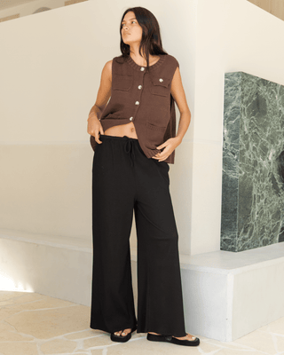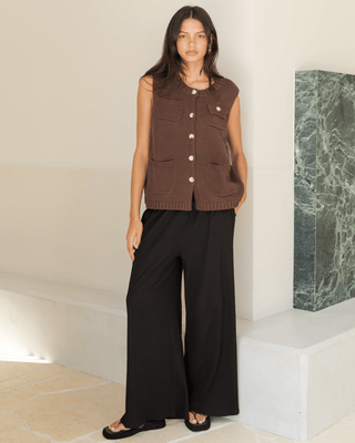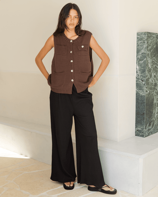 The Maeve Vest in Brown is the perfect addition to your everyday capsule wardrobe. Crafted from 100% cotton knit, it offers a breathable and soft feel while maintaining structure and polish. With its boxy, relaxed fit and button-up front, Maeve is made for layering over your favourite tanks, dresses or blouses.