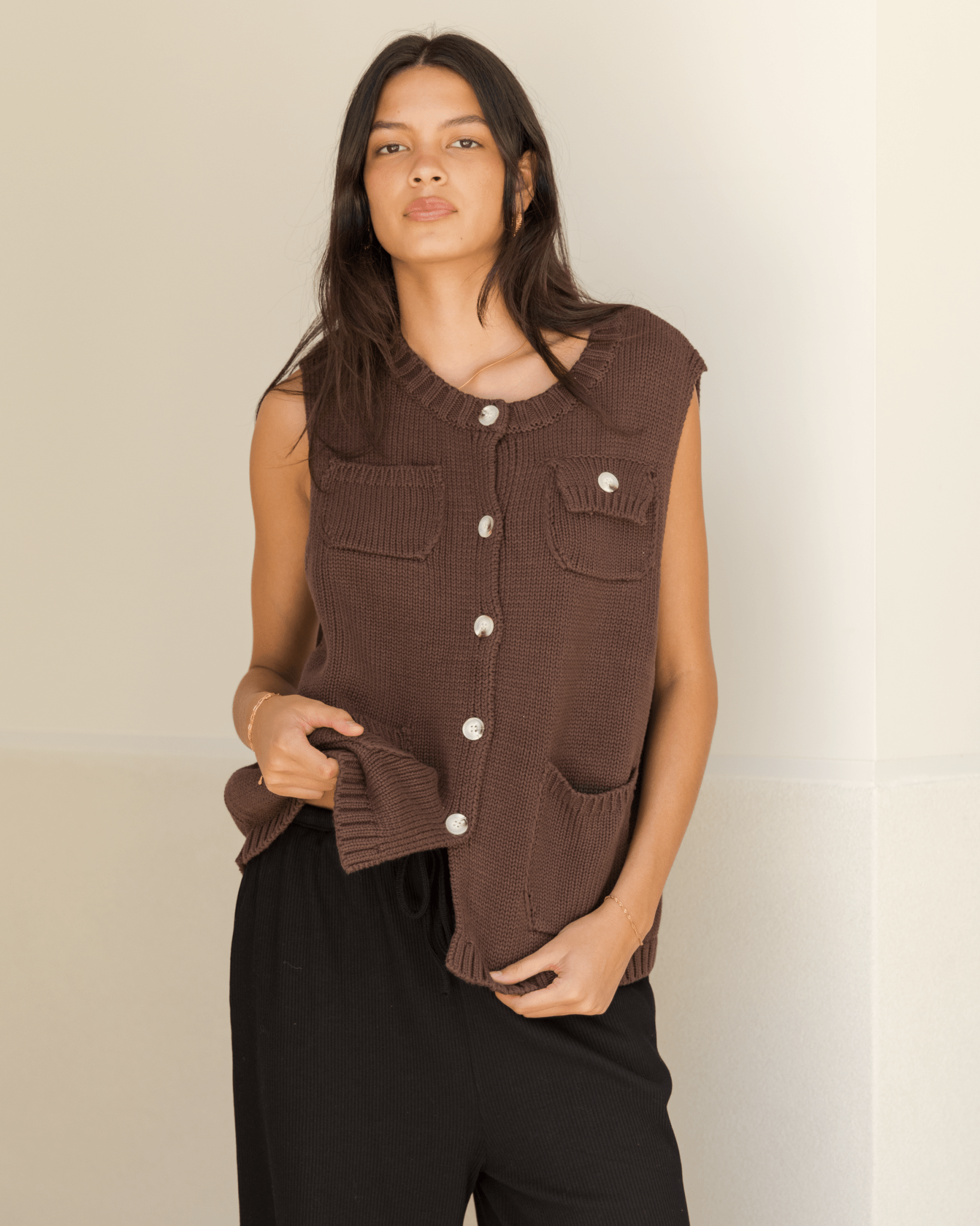 The Maeve Vest in Brown is the perfect addition to your everyday capsule wardrobe. Crafted from 100% cotton knit, it offers a breathable and soft feel while maintaining structure and polish. With its boxy, relaxed fit and button-up front, Maeve is made for layering over your favourite tanks, dresses or blouses.