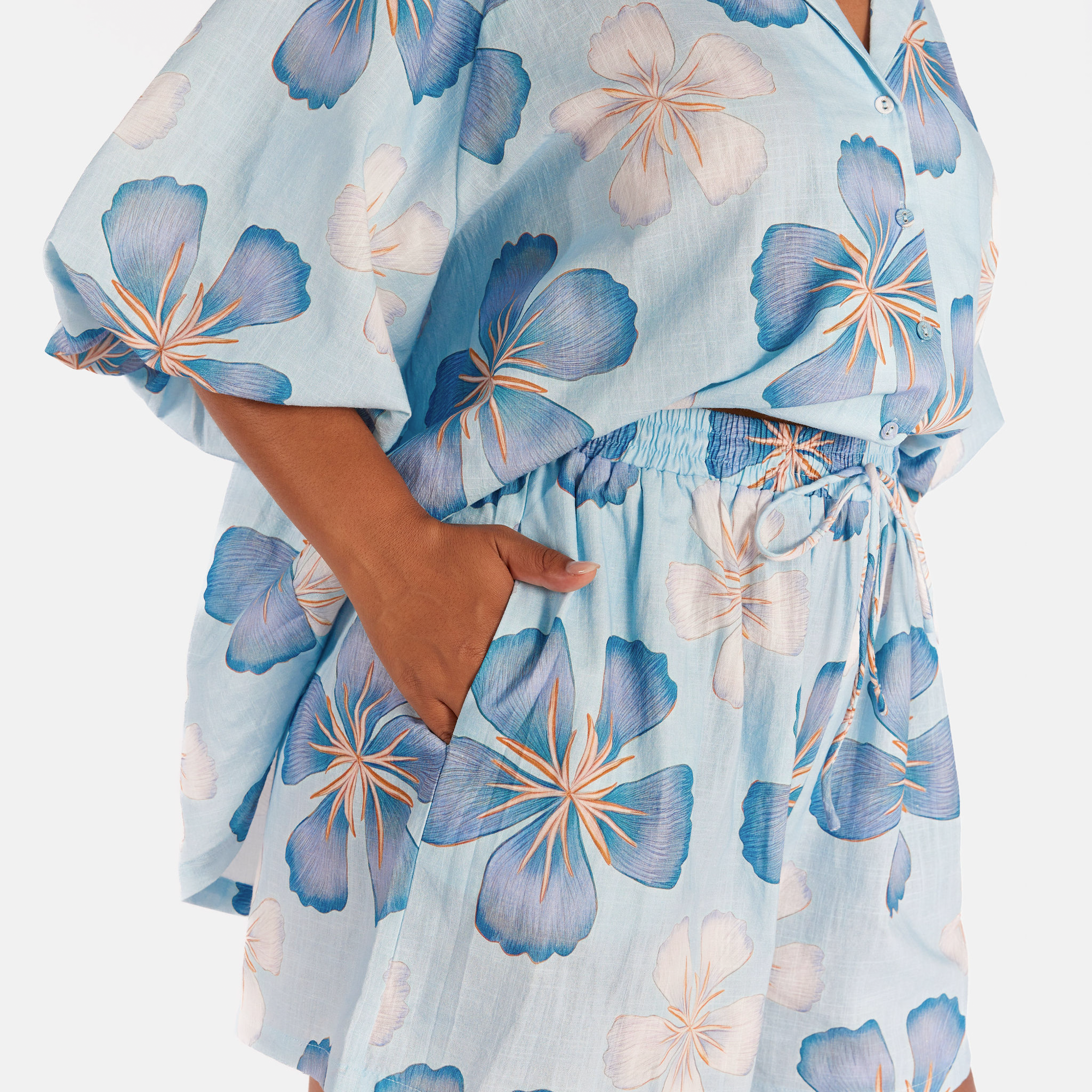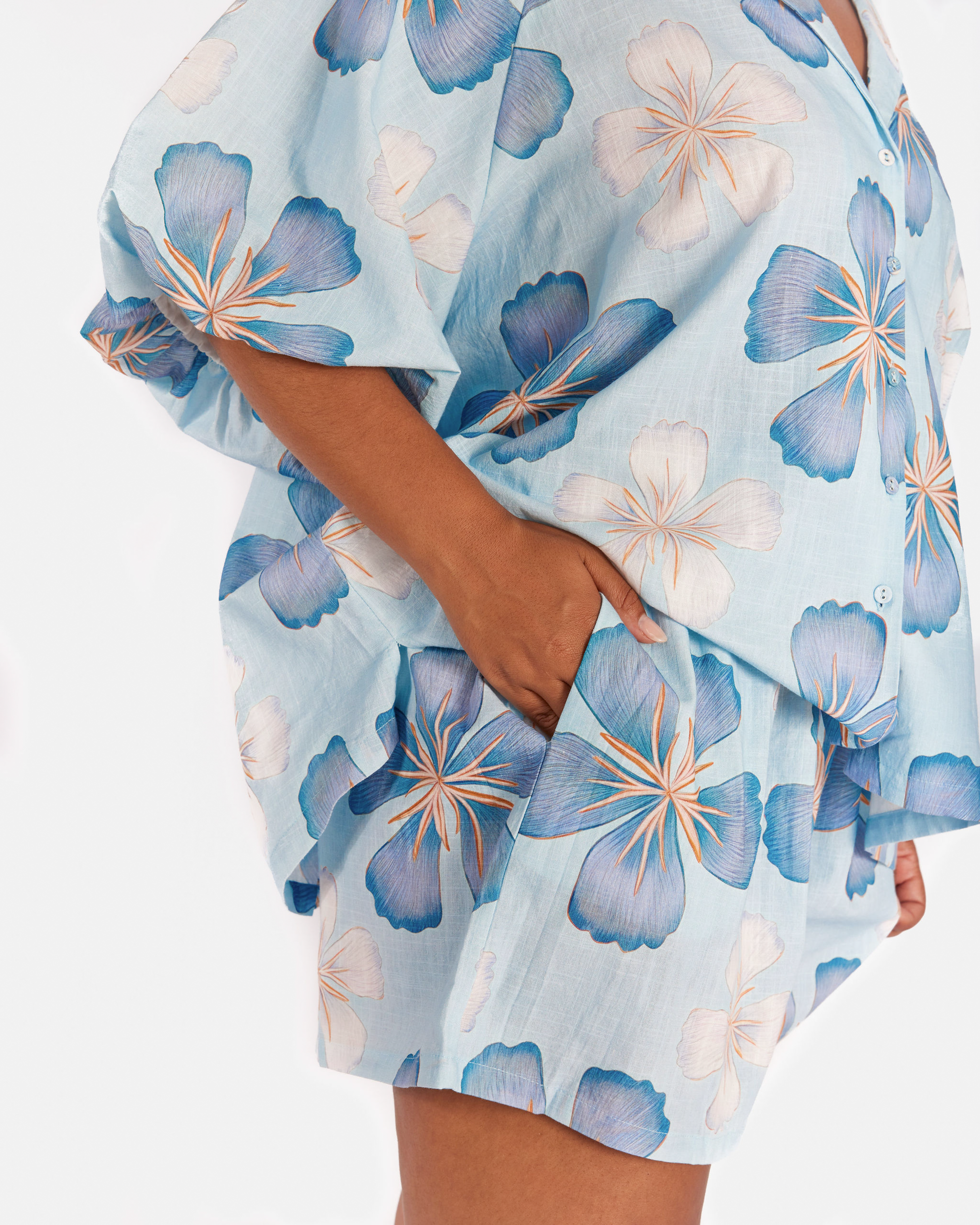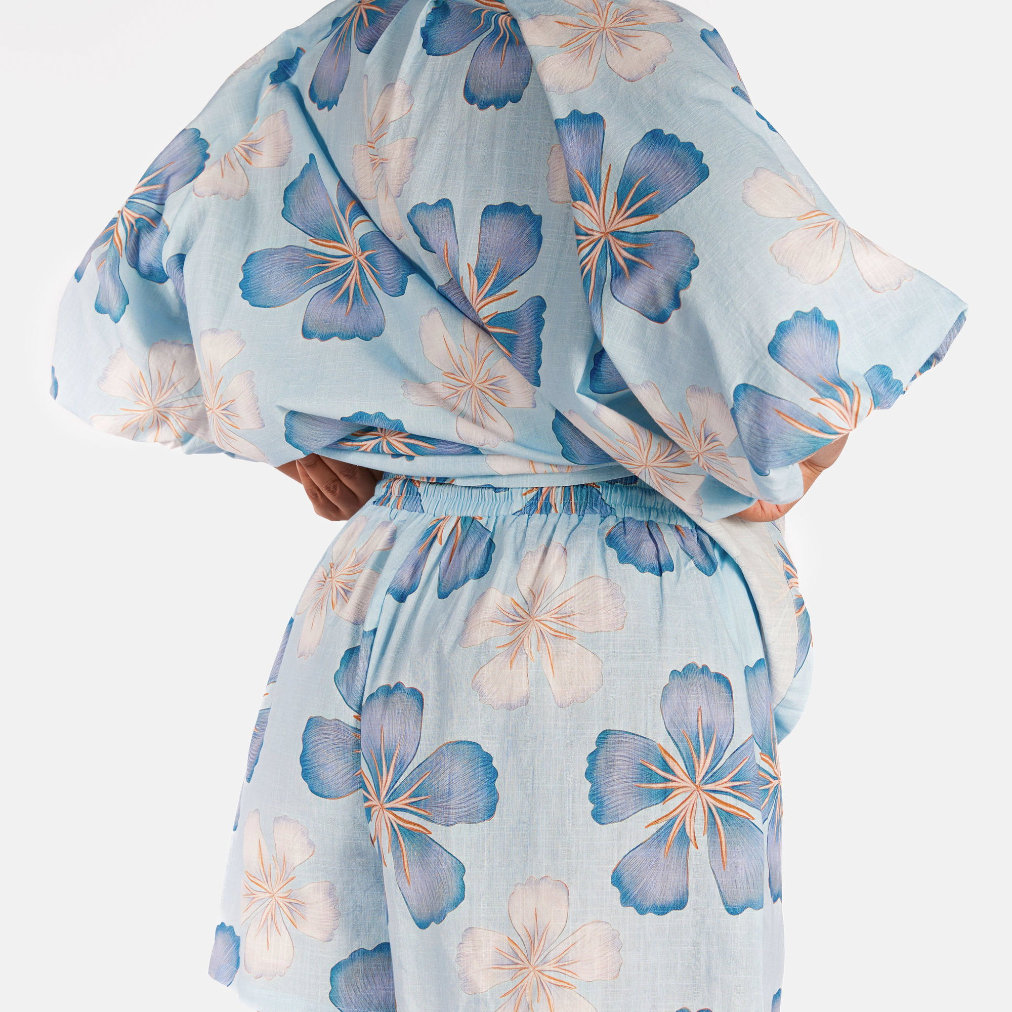 The exclusive Art by Saint print showcases a hand drawn blue base layered with darker blue florals and soft white flowers. The print feels calming, fresh, and easy to style, giving you that effortless look without even trying.
