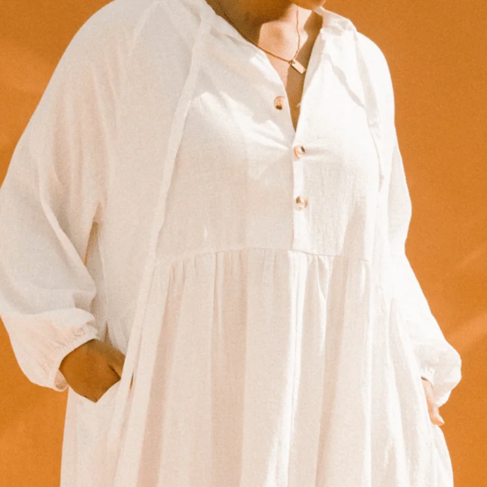 We’re talking billowed sleeves for the drama, functional buttons and pockets for the practicality. And yes — she’s made from 100% cotton, so it’s all breathable, all day.