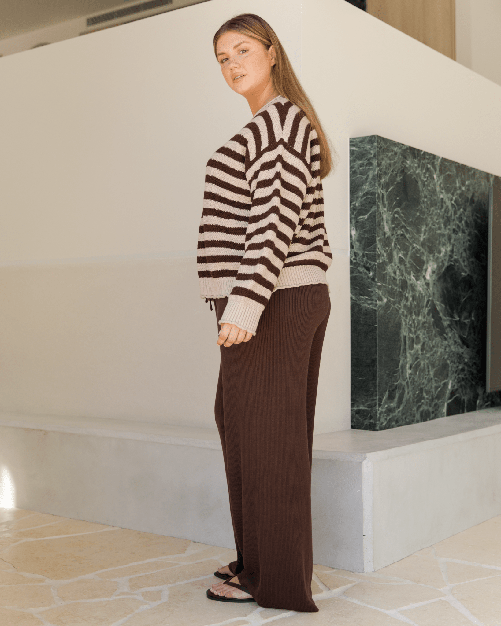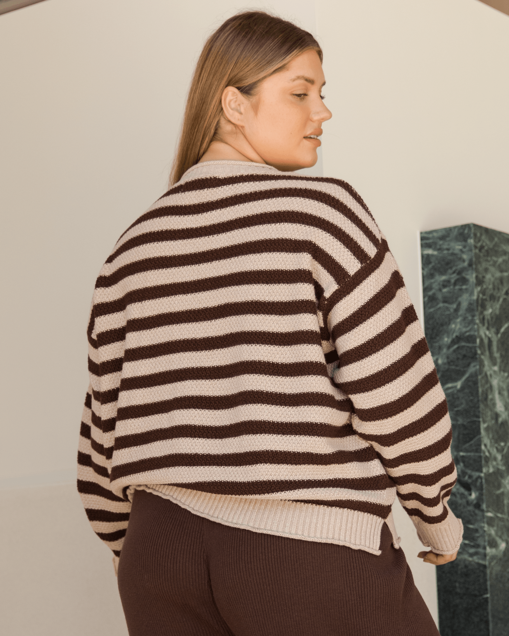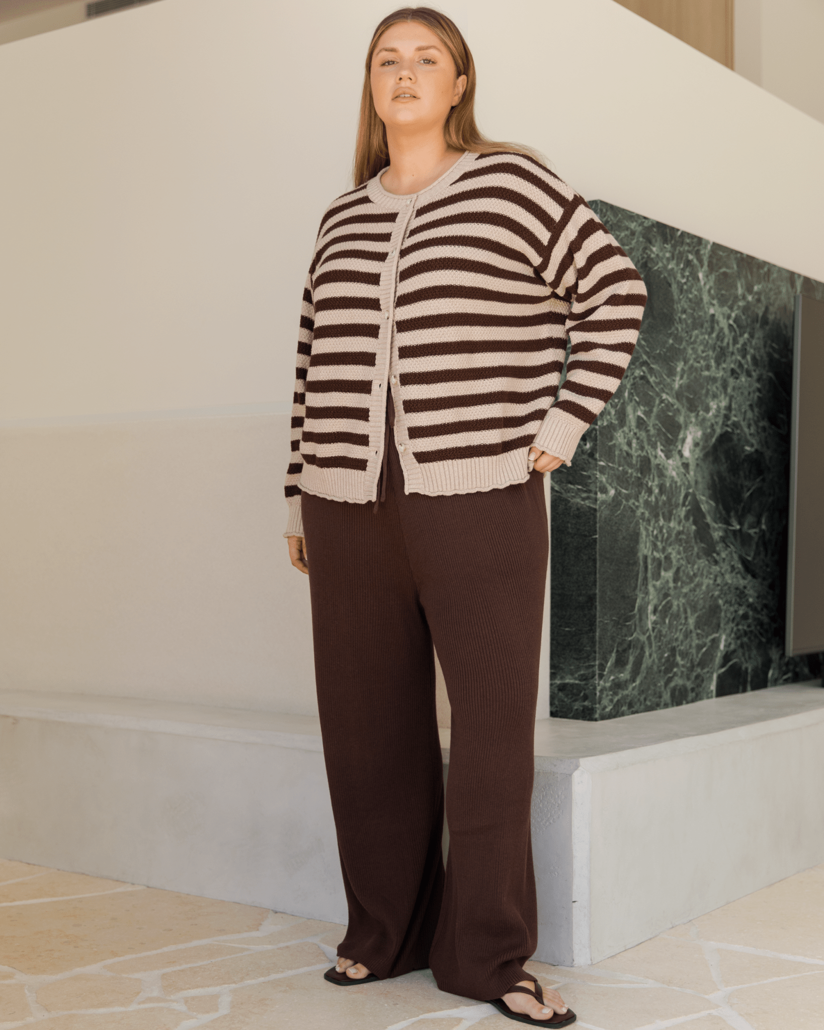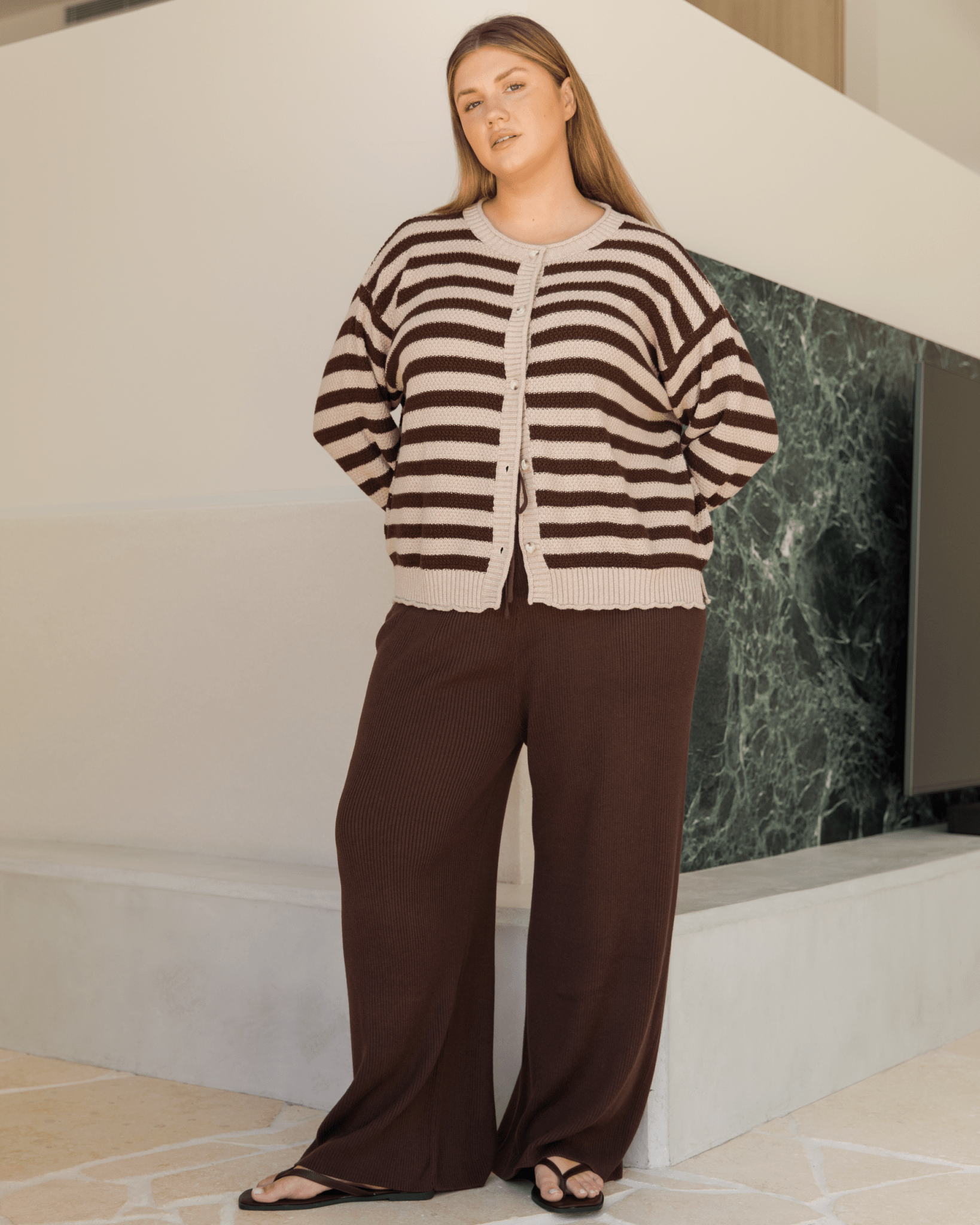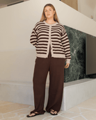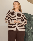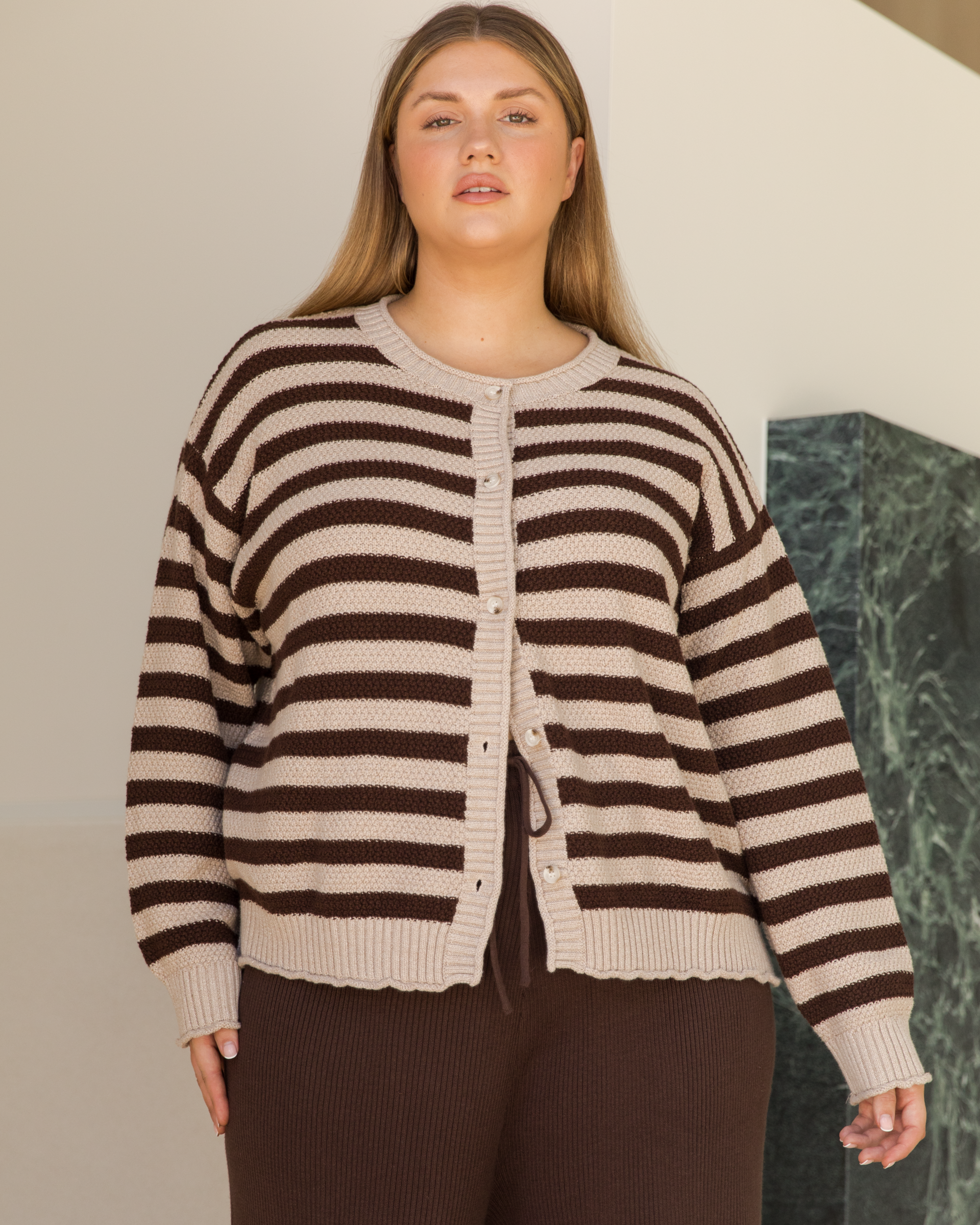 With a classic crew neckline, functional buttons, and a relaxed drop-shoulder fit, the Betty Cardi gives off that effortless, throw-on-and-go energy we all love. The warm brown and oat stripes make it super versatile — easy to pair with your favourite loungewear, denim or layered over dresses.