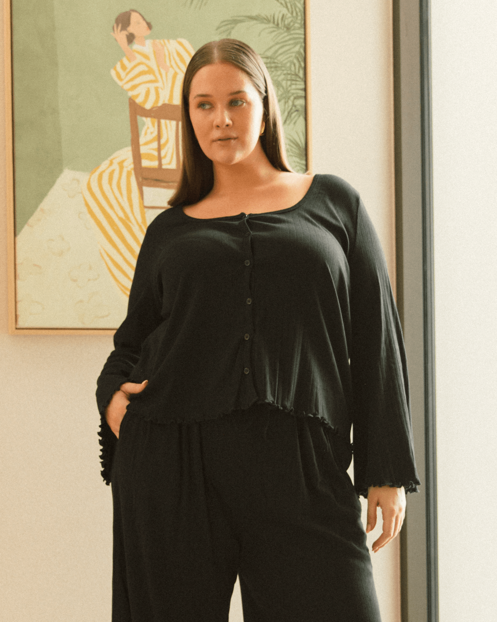 The Ava Top is your go-to for those slow, soul-soothing mornings or easy days spent lounging around. Crafted from soft cotton pointelle fabric with just the right amount of stretch, it’s light, breathable, and oh-so-gentle on the skin. With a relaxed fit, cute lettuce-edge hems and a functional button-up front, this piece layers beautifully over bralettes or nursing crops—making it a quiet hero for breastfeeding mamas too.