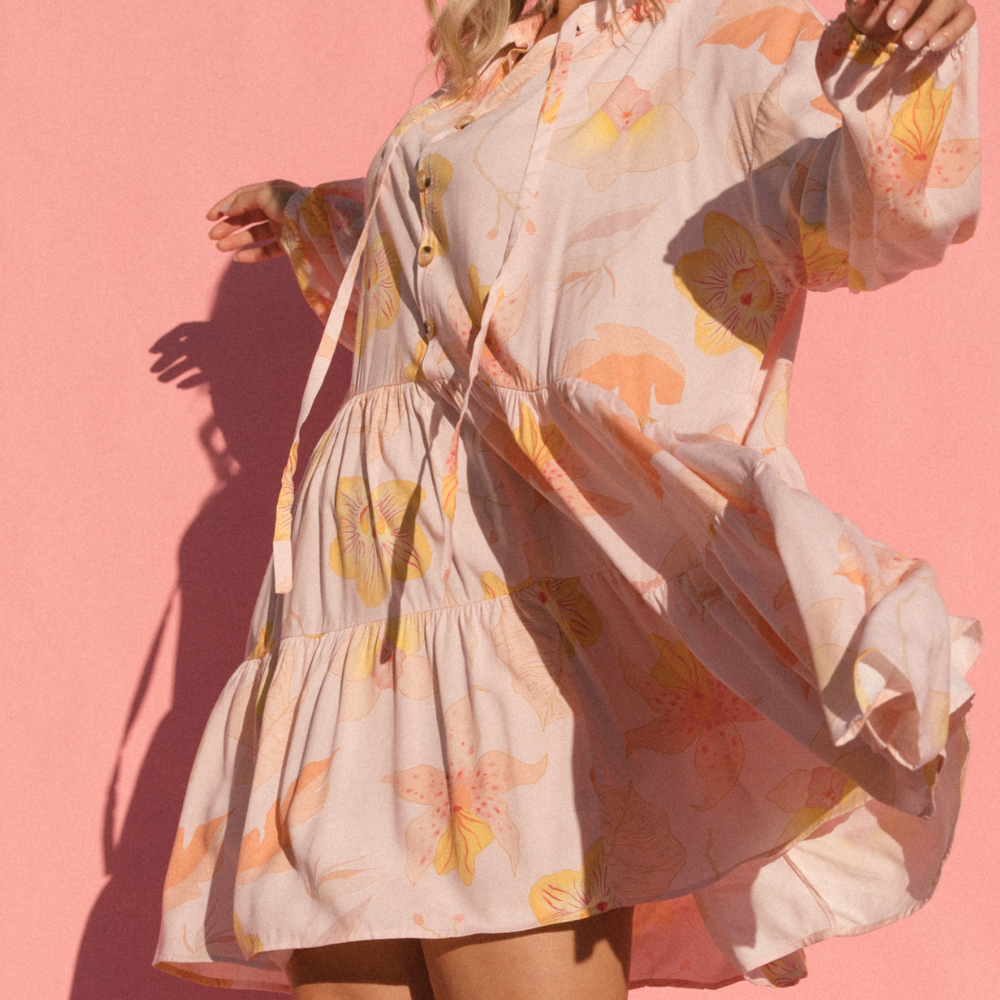 The billowing sleeves with elastic cuffs add a feminine and chic look.Made from 100% Rayon fabric, this dress is breathable and perfect for all-day wear. The Dune Bloom print adds a fun and playful touch to your outfit, perfect for any occasion.