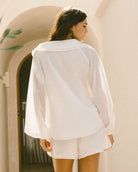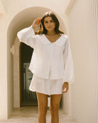 The Haisley Top is a versatile wardrobe staple crafted from 100% cotton for a breathable and comfortable feel. Fully lined for added coverage, it features a crisp white color that pairs effortlessly with any outfit. The delicate collar detail and button-down front add a charming, timeless touch, making it easy to dress up or down. Designed with long sleeves, this top offers lightweight coverage, perfect for transitioning between seasons. Whether styled with matching Haisley Shorts or your favourite denim, the Haisley Top brings easy elegance to your everyday looks.