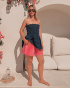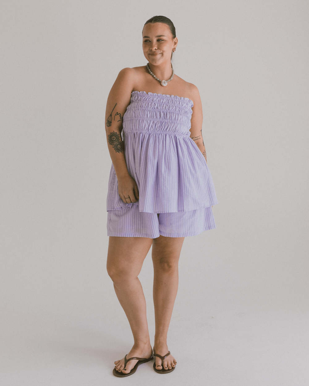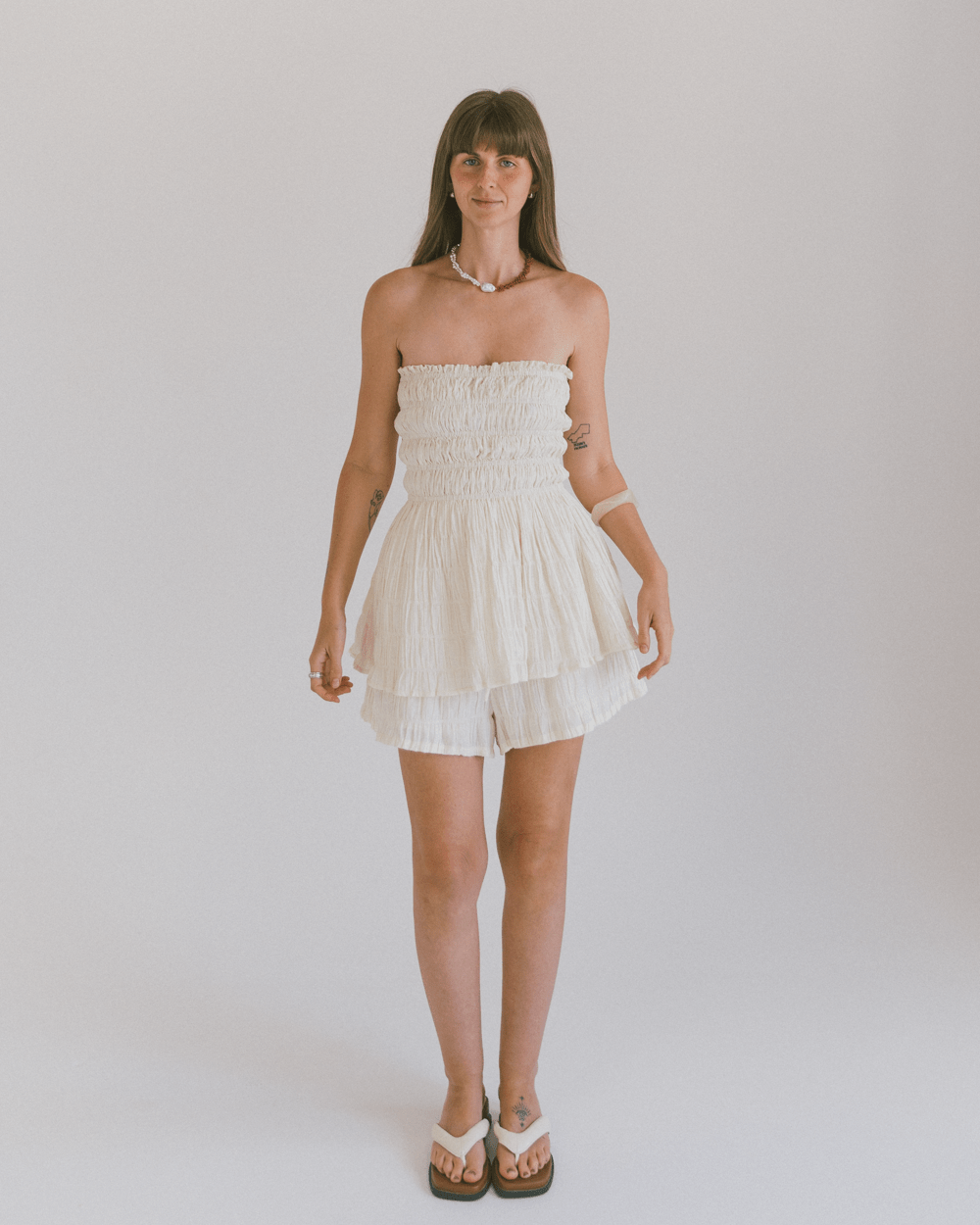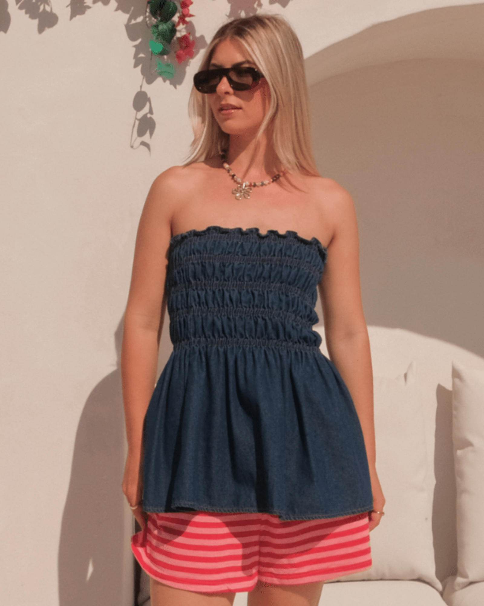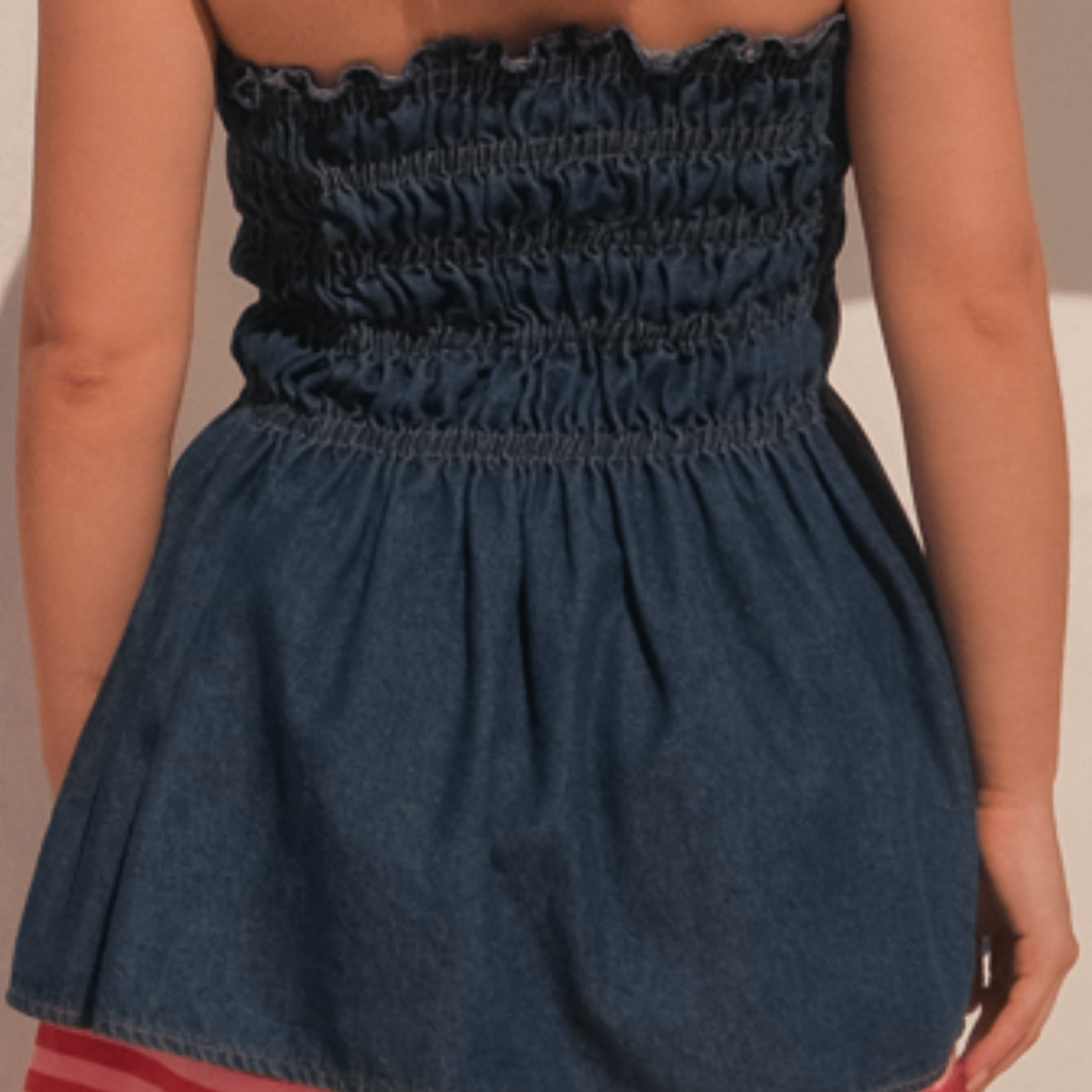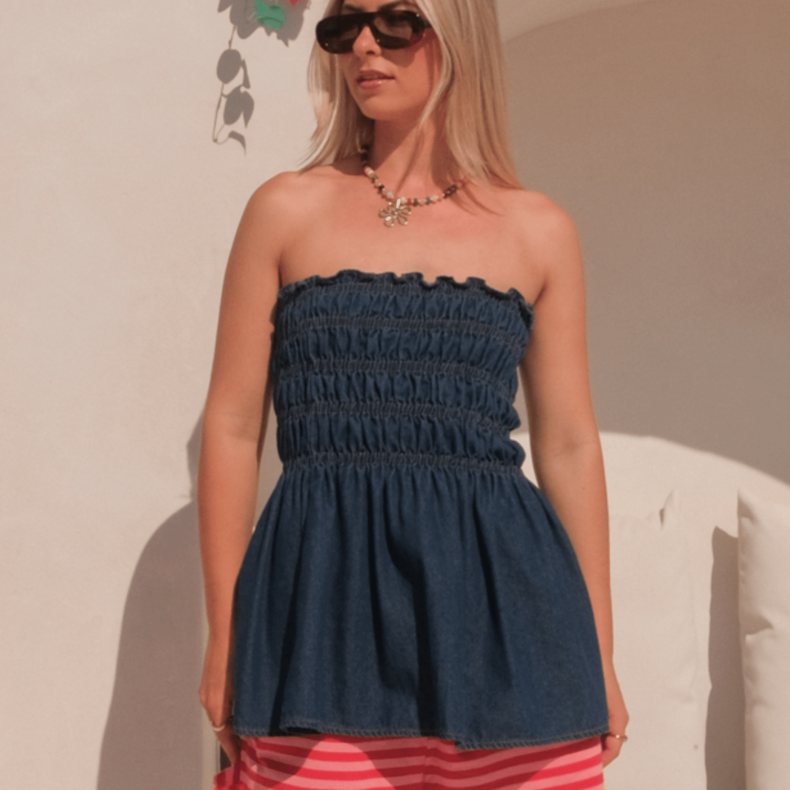 Meet the Mabel Top — your new effortless go-to for those “cute but comfy” days. With her strapless neckline and shirred bust, she’s got that easy, throw-on charm that feels just as good as it looks. Whether you’re dressing her up for brunch or keeping it chill at home, Mabel moves with you and always looks the part.