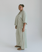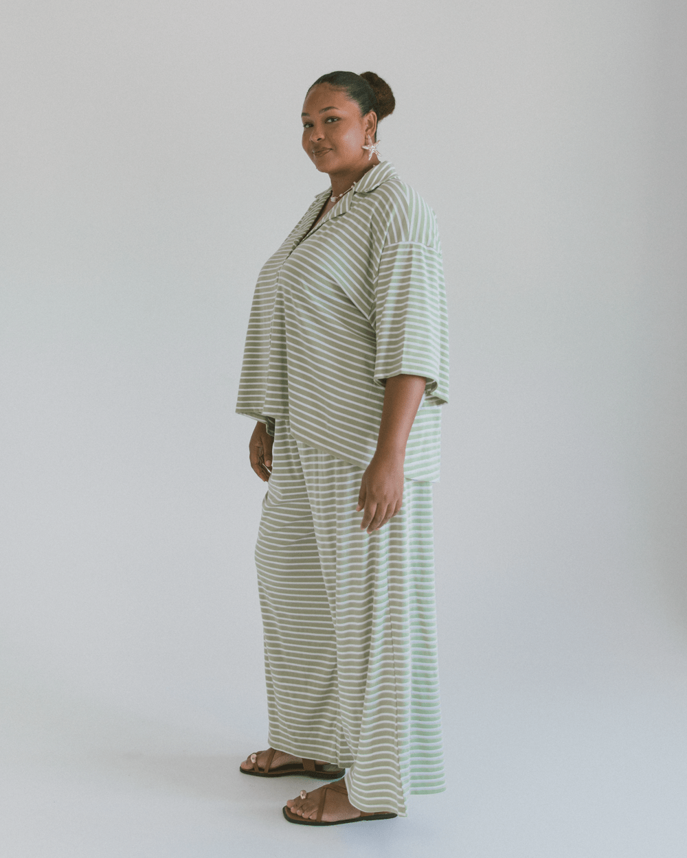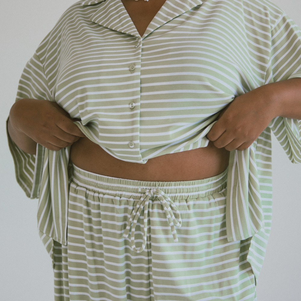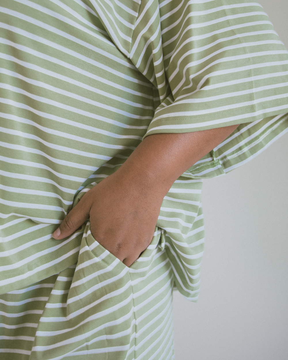 The soft green stripe is fresh, fun and goes with pretty much everything. Wear it with the matching shorts or pants for a full set moment or mix it with your favourite denim or leggings.