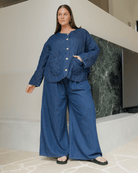 Style it your way — buttoned up with our wide-leg denim pants for a matching moment, or thrown over soft cotton pants and slides for that effortless, everyday vibe.