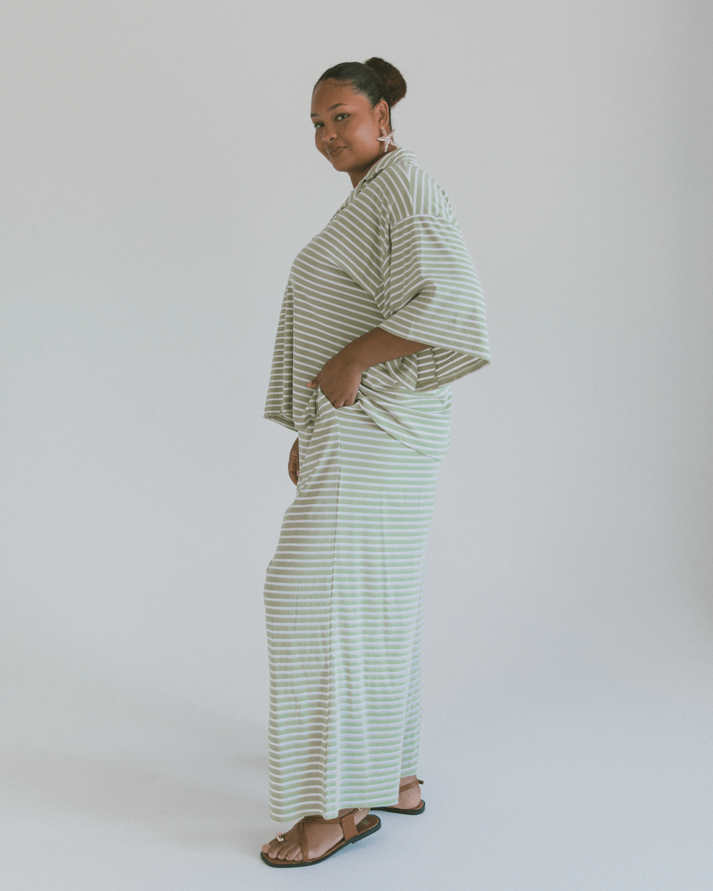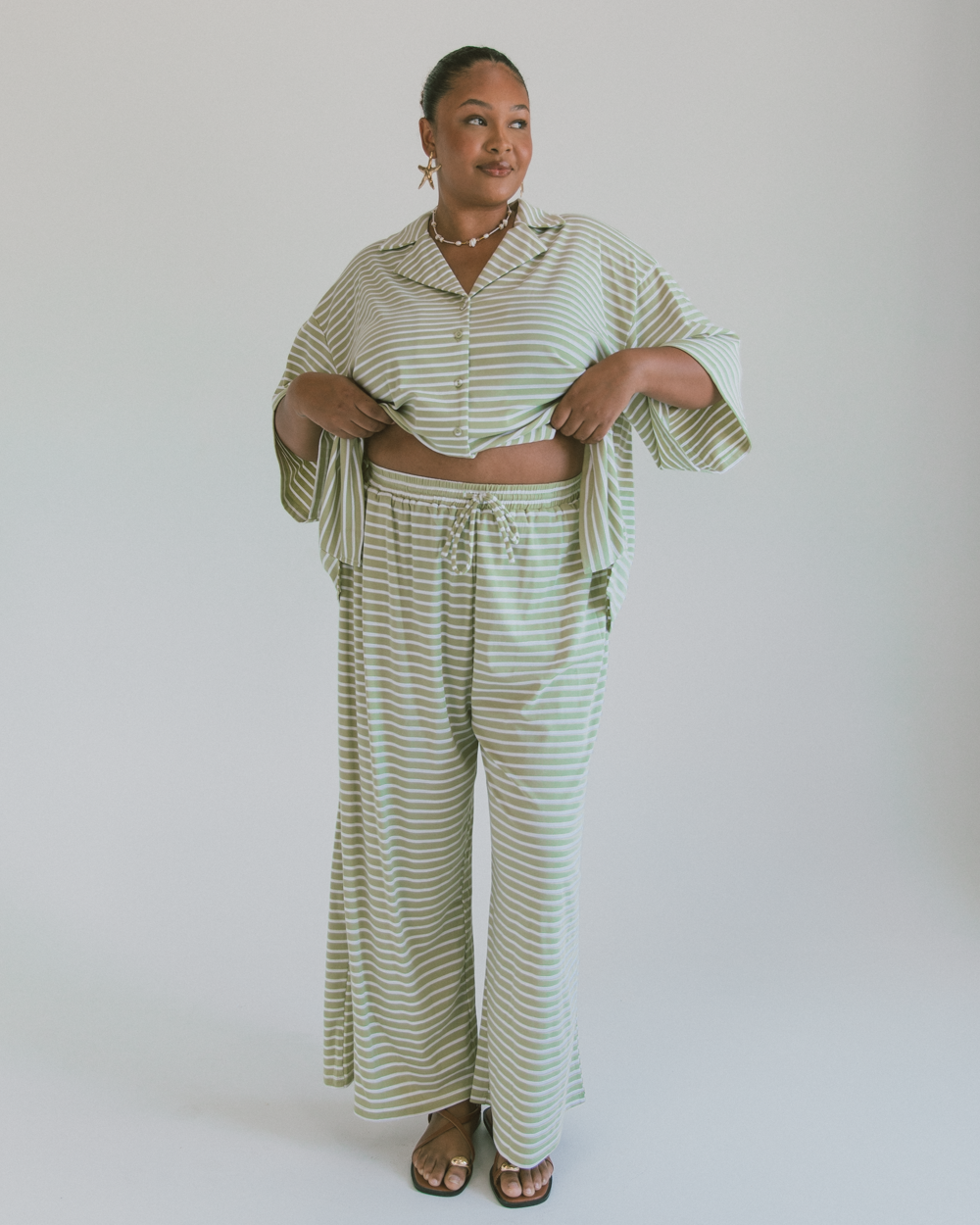 The soft green stripe gives them an easy going, coastal feel that works for lounging at home, running errands or styling up with the matching shirt for a full set moment that looks cute with zero effort.